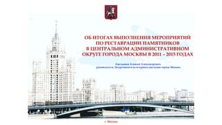 Документ содержит итоги реставрационных мероприятий по памятникам культурного наследия в Центральном административном округе Москвы за 2011-2015 годы. За этот период было восстановлено 115 объектов, финансируемых как из бюджетов города, так и частными инвесторами, что значительно улучшило состояние объектов культурного наследия. Сравнительный анализ показывает, что количество памятников в неудовлетворительном состоянии сократилось на 46%.