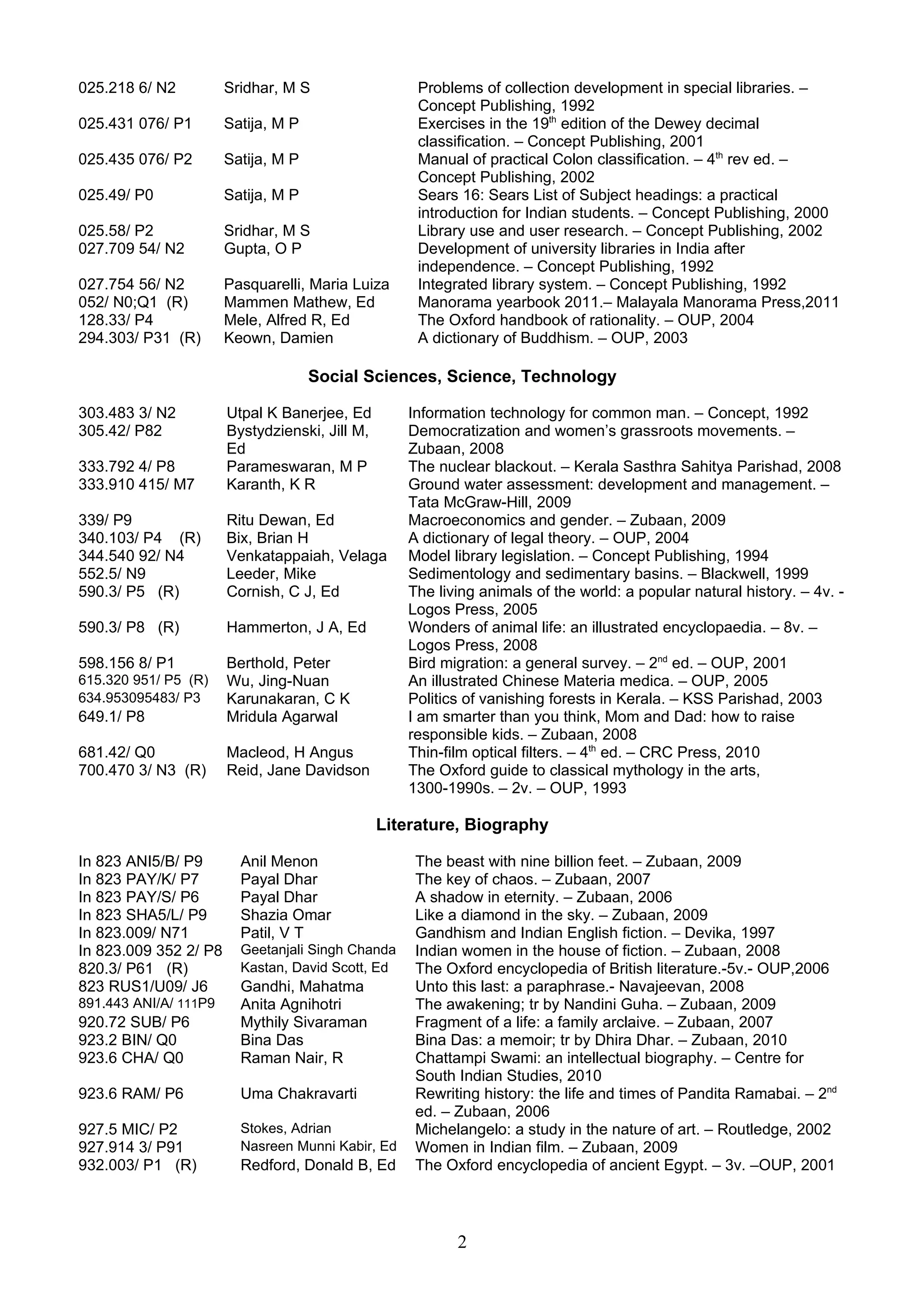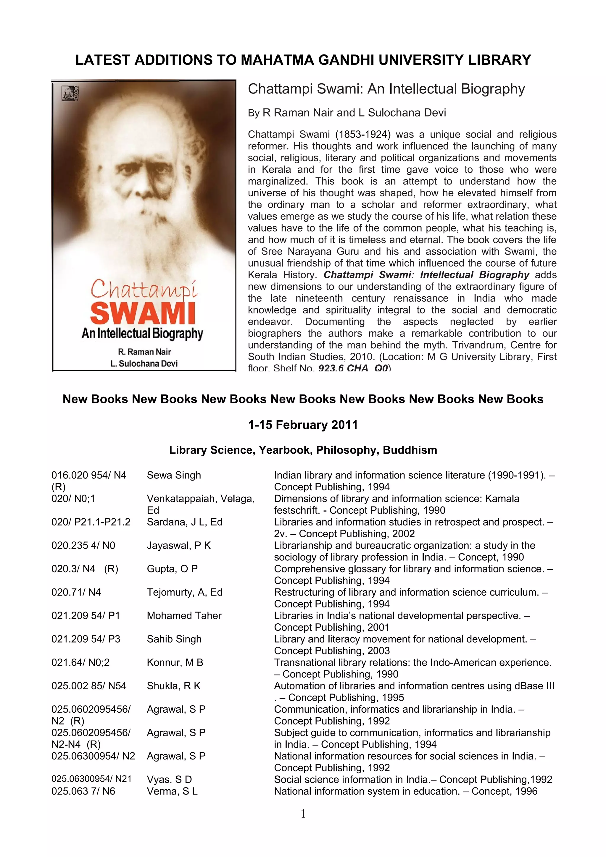 The document provides details about new additions to the library of Mahatma Gandhi University. It summarizes an intellectual biography about Chattampi Swami published in 2010. Chattampi Swami was a 19th century social and religious reformer from Kerala whose thoughts influenced many social, religious and political movements. The book aims to understand how his ideas developed and his extraordinary life and influence. It also discusses his relationship with Sree Narayana Guru and how it impacted Kerala's history. The biography adds new dimensions to understanding this important figure of the late 19th century Kerala renaissance.