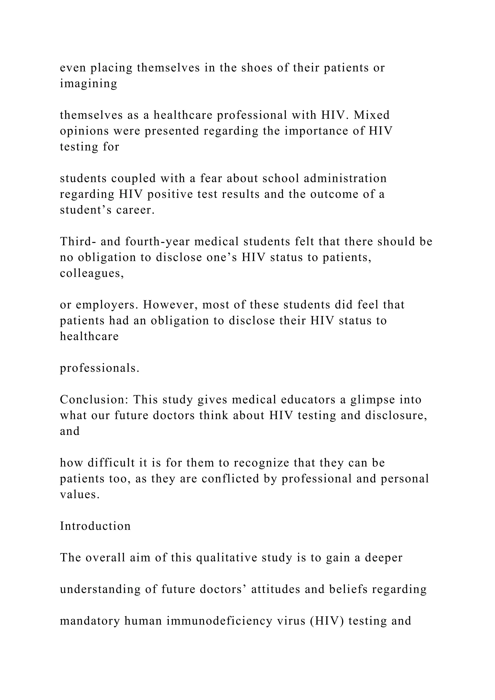 The study explores medical students' attitudes towards mandatory HIV testing and disclosure, highlighting mixed opinions on the obligation to disclose HIV status for both healthcare professionals and patients. Although there is a general understanding of the importance of testing, students express fear regarding the impact of positive results on their careers and emphasize the need for education to mitigate stigma. The findings aim to inform medical ethics education and provide insights into how future doctors navigate the complexities of HIV testing and disclosure.