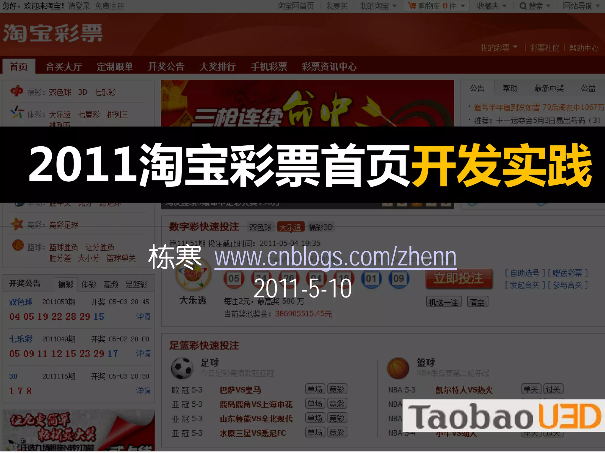 该文档讨论了淘宝彩票首页的开发实践,强调了合理的内容展现顺序、模块化开发和优化页面速度与性能的重要性。提出了优化策略,包括减少HTTP请求、采用异步加载以及精简DOM节点数。同时,提到使用YUI3和GSAP等工具以提高用户体验和页面渲染效率。