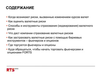 Документ рассматривает финансовые риски, связанные с изменением валютных курсов, и способы их хеджирования с помощью биржевых инструментов, таких как фьючерсы и опционы. Он описывает механизмы оценки валютных рисков, преимущества и недостатки различных инструментов страхования, а также предоставляет информацию о торговле и вариантах валютных контрактов на российской фондовой бирже. Кроме того, документ подчеркивает, как страхование валютных рисков может помочь компаниям улучшить планирование финансовых потоков и снизить неопределенность в доходах и затратах.
