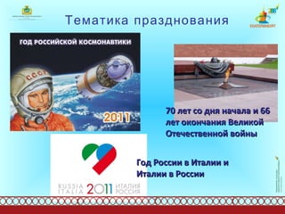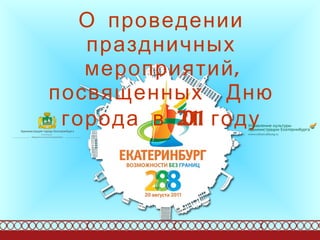 В документе описываются праздничные мероприятия, посвященные дню города Екатеринбурга в 2011 году, которые пройдут с 6 по 21 августа и включают более 40 событий для разных возрастных групп. Тематика празднования связана с Россией и Италией, а также с юбилеями Великой Отечественной войны. Основные события включают конкурсы, выставки, спортивные соревнования и концерты, завершающиеся фейерверком 20 августа.