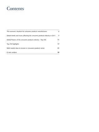 The document provides an economic outlook for 2011 and discusses challenges facing the consumer products industry. It predicts stronger global growth led by emerging markets. The US economy is expected to improve due to tax cuts and monetary stimulus, but housing and debt deleveraging may constrain growth. European growth will be slow and uneven across northern and southern countries dealing with austerity measures. The consumer products industry faces a frugal "new normal" consumer and changing spending patterns across markets.