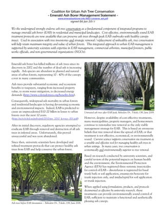 The document is a statement from the Coalition for Urban Ash Tree Conservation endorsing ash tree conservation as part of emerald ash borer (EAB) management programs. It argues that cost-effective insecticide treatments are available to preserve ash trees during EAB outbreaks and that treatment, combined with removal of unhealthy trees, can help maintain the integrity of urban forests. While removal was initially attempted to control EAB, current research supports treatment as an effective and environmentally sound strategy, especially when the economic and environmental benefits of ash trees are considered.