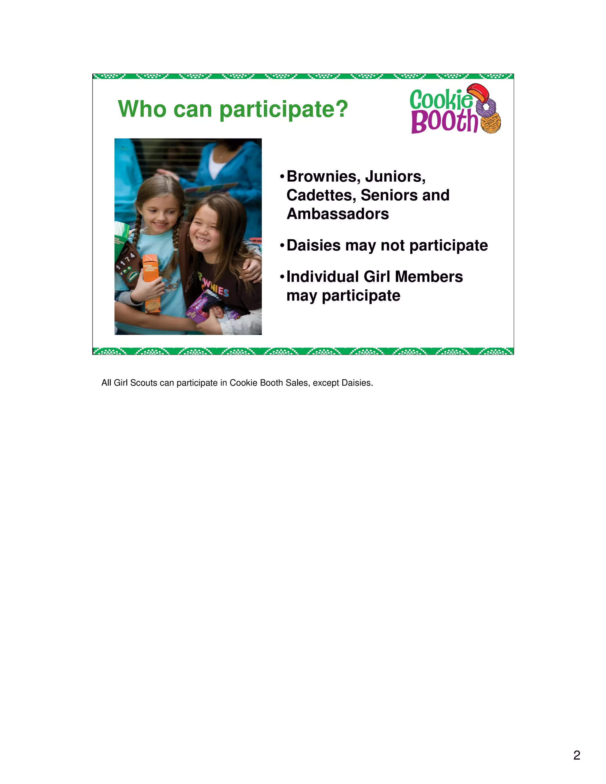 The document provides information for Girl Scout troops on how to conduct cookie booth sales, including: