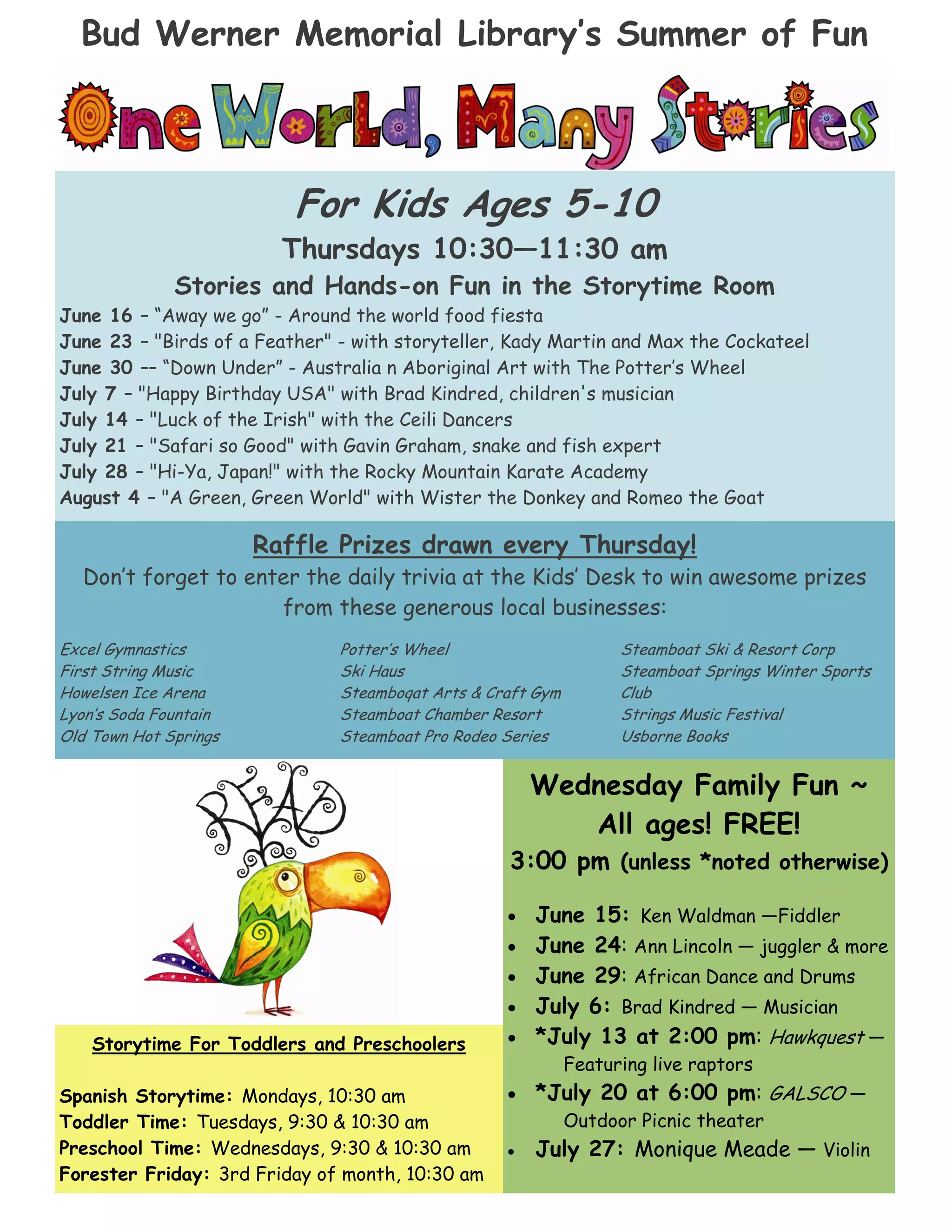 This document provides details about children's summer programs at the local library for kids ages 5-10 on Thursdays from 10:30-11:30am. It lists the weekly themes and special guests for the storytime and hands-on activities from June 16th through August 4th. It also notes that raffle prizes will be drawn each Thursday from local businesses. Additional family programs on Wednesdays at 3pm and storytimes for toddlers and preschoolers on other days of the week are listed at the bottom.