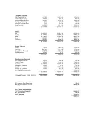 The 2011 budget for Pine Tree Condominiums projects total revenue of $299,514 and total expenses of $296,105, leaving projected net income of $3,409. Major expenses in 2011 include payroll and benefits at $60,220, repairs and maintenance at $42,473, utilities at $110,658, and insurance at $14,289. The budget also allocates $15,000 for capital improvements in 2012.