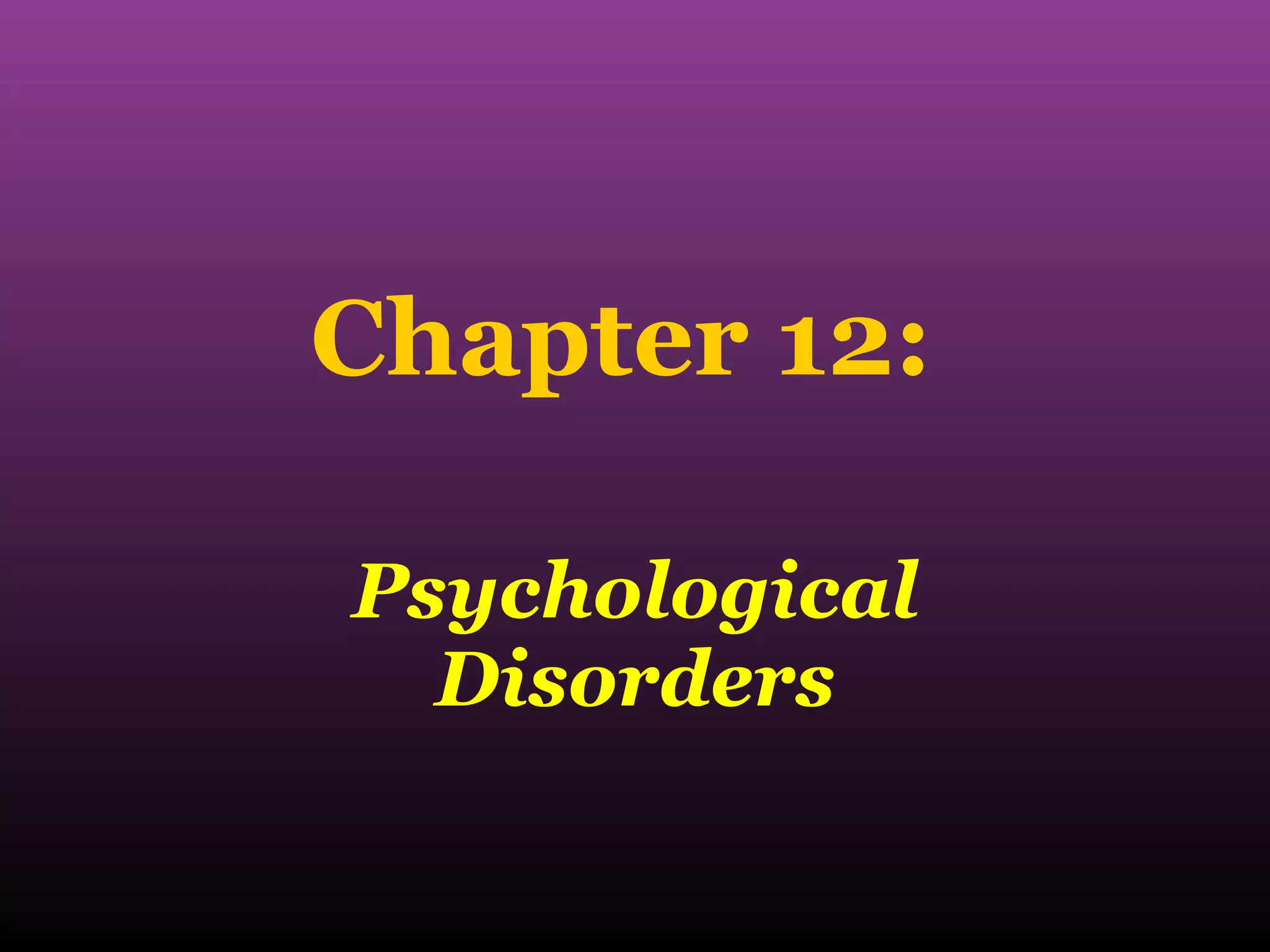 This chapter discusses various psychological disorders including abnormal behavior, classifying mental disorders, psychotic disorders, mood disorders such as depression and bipolar disorder, anxiety disorders like phobias and panic disorder, dissociative disorders, personality disorders, sexual and gender identity disorders, and psychosomatic and somatoform disorders. Biological, psychological, and social factors can all contribute to the development of these conditions.
