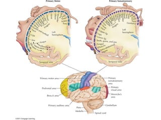 The document explains the structure and function of the nervous system, detailing components such as neurons, synapses, and neurotransmitters, as well as the central and peripheral nervous systems. It also discusses neuroplasticity, the role of the brain in processing information, and the function of various glands in the endocrine system. Key concepts include the cerebral cortex's specialization, the significance of contralateral control, and the impact of neurotransmitters on behavior and emotions.