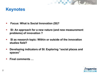The document explores the concept and measurement of social innovation (SI), emphasizing its significance in addressing contemporary social challenges and enhancing quality of life. It discusses the intertwining nature of SI with technological and economic innovations and presents frameworks for understanding and measuring SI. Additionally, it highlights various social innovation initiatives and calls for further research to refine measurement methodologies and theoretical frameworks.