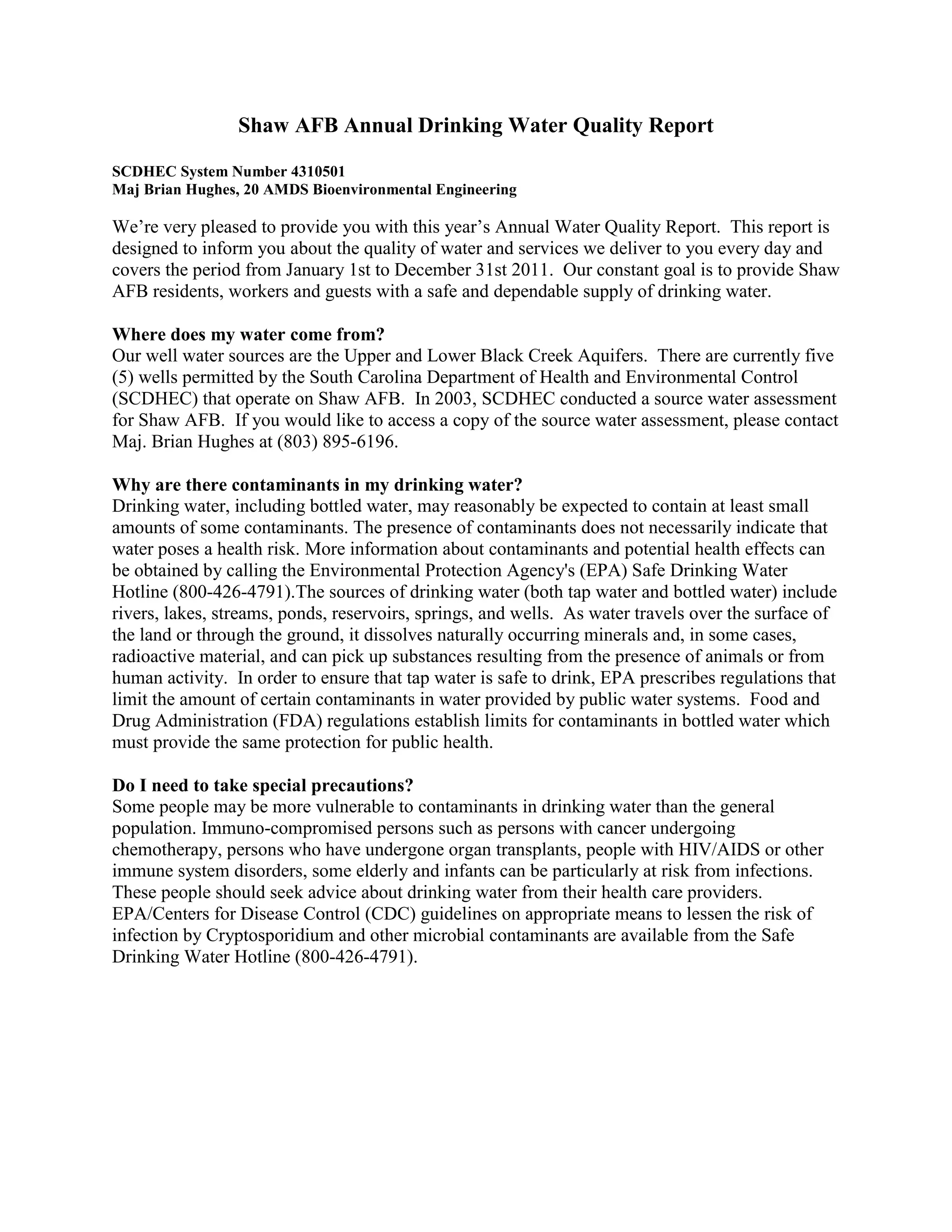 Shaw AFB provides an annual water quality report to inform residents, workers, and guests about the quality of drinking water. The report covers the period from January to December 2011. Water sources are wells that draw from the Upper and Lower Black Creek Aquifers. Testing found levels of contaminants like chlorine, nitrate, fluoride, trichloroethylene, alpha particles, and radium below EPA standards. Special precautions for some contaminants are advised for vulnerable groups.