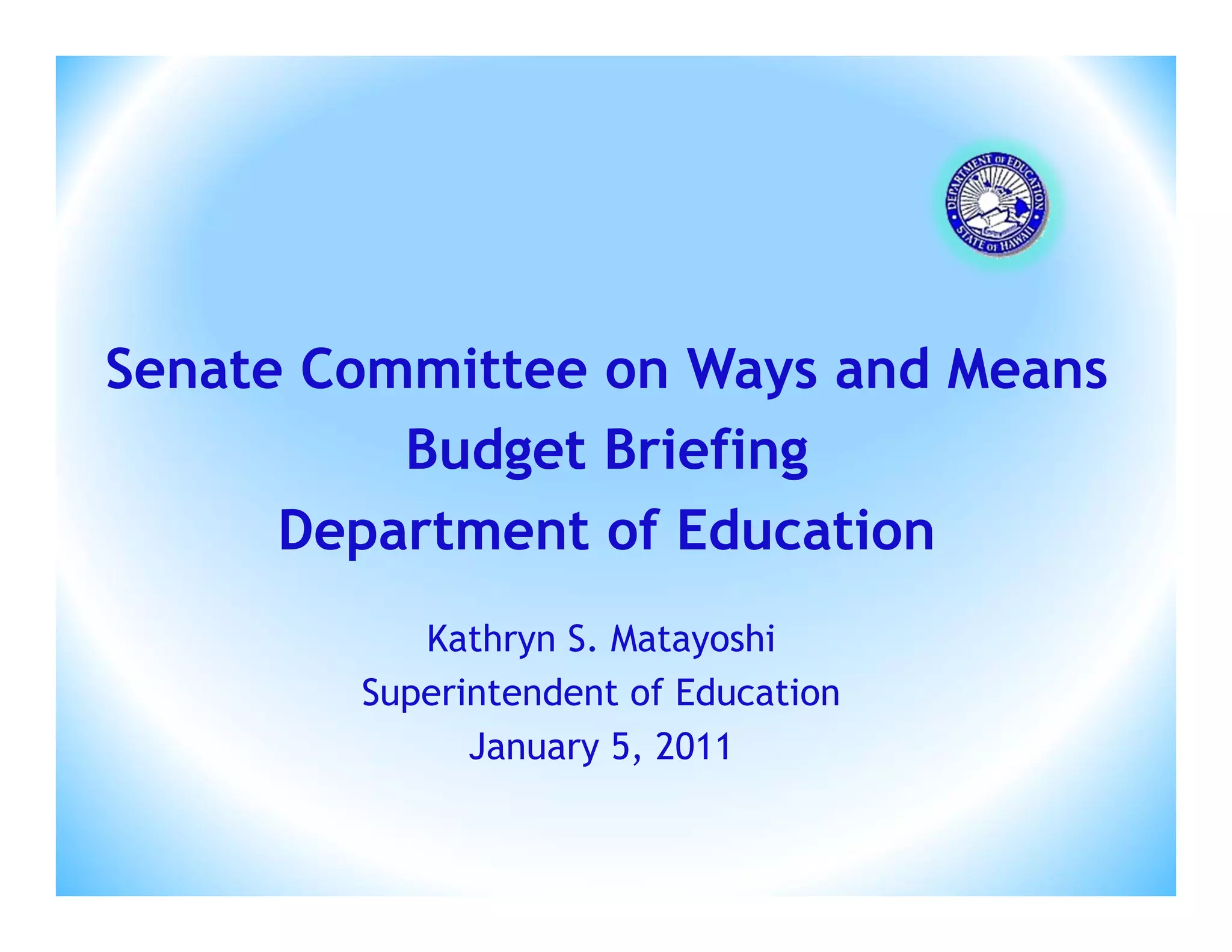 The document provides an overview of the Hawaii Department of Education's budget and operations. It summarizes enrollment trends, test score improvements, the impacts of budget cuts, use of federal stimulus funds, and plans to pursue a Race to the Top grant. Key priorities include implementing the Common Core standards, improving teacher and leader effectiveness, turning around low-performing schools, and enhancing data systems to support student achievement.