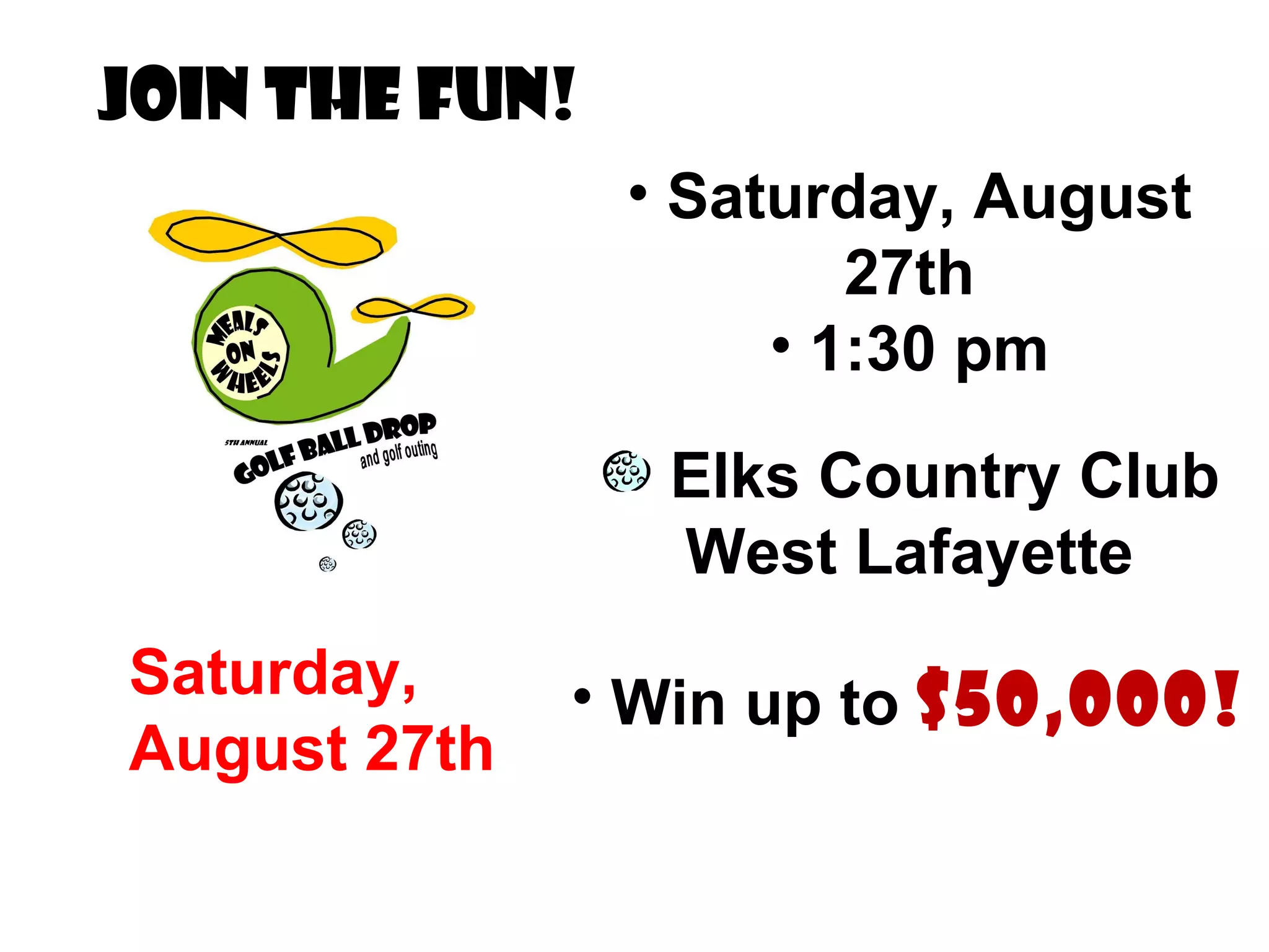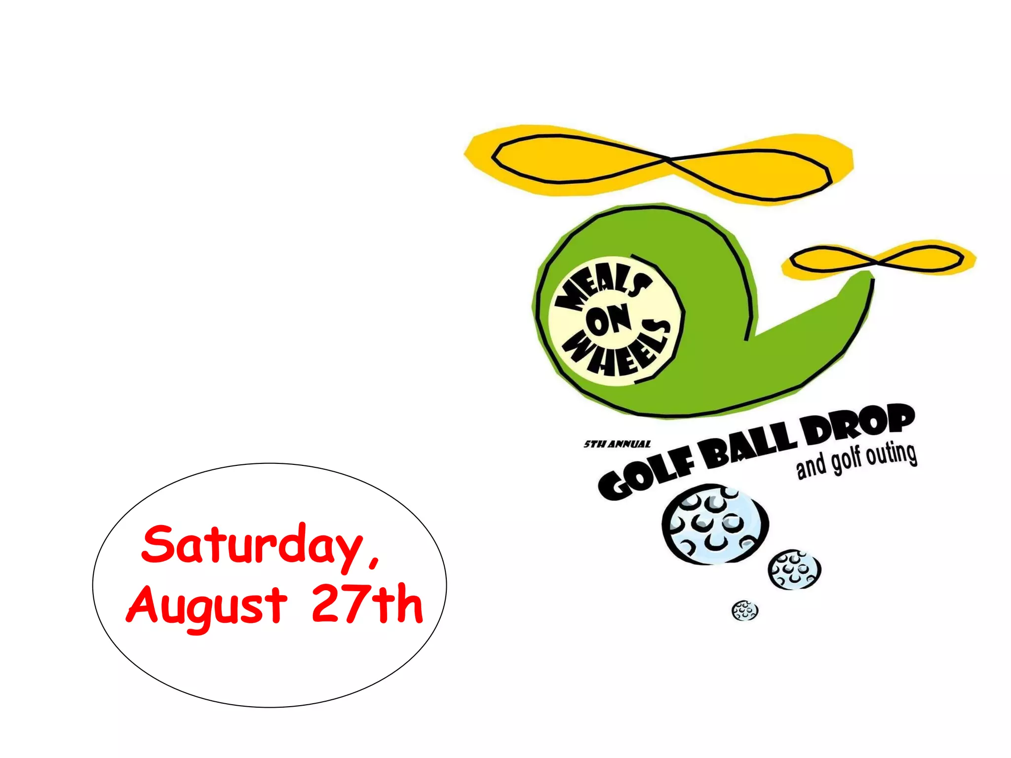 The document announces an event on August 27th where a helicopter will drop 5,000 numbered golf balls over a country club to raise money for Meals on Wheels. Participants can purchase individual golf balls or buckets of balls, and prizes will be awarded to the balls that land closest to or in the hole, including a grand prize of up to $50,000. The day will include a golf tournament in the morning and the ball drop in the afternoon.