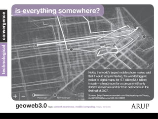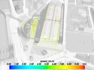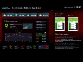 The document discusses how information technology is profoundly impacting how the built environment is planned, designed, constructed, and operated. It mentions examples of using multi-disciplinary simulation, visualization, parametric modeling, 3D GIS, and BIM technologies in major infrastructure and building projects. It also discusses using continuous post-occupancy feedback and data shadows to better understand resource use and adapt buildings over time. Finally, it explores the potential of urban informatics and ambient information displays to make cities more efficient, connected, and provide a high quality of life for citizens.