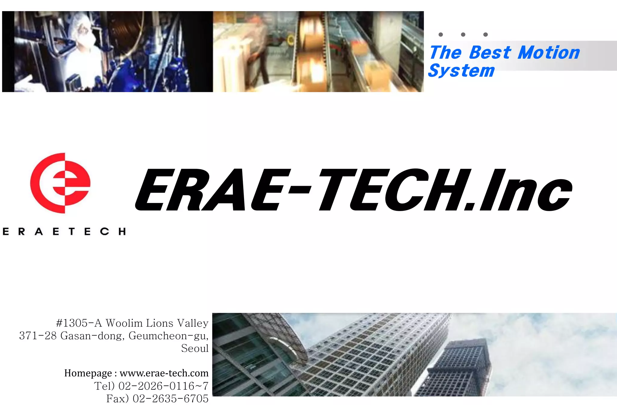 The document provides information about ERAE-TECH Inc., a motion control and auto systems company. It discusses the company's vision of convenience for humans, history starting in 2003, partners in countries like Germany and China, and products such as ICs, modules, pan-drivers, motors, and drivers. The company aims to contribute to the automatic industry through endless product development and customer service.