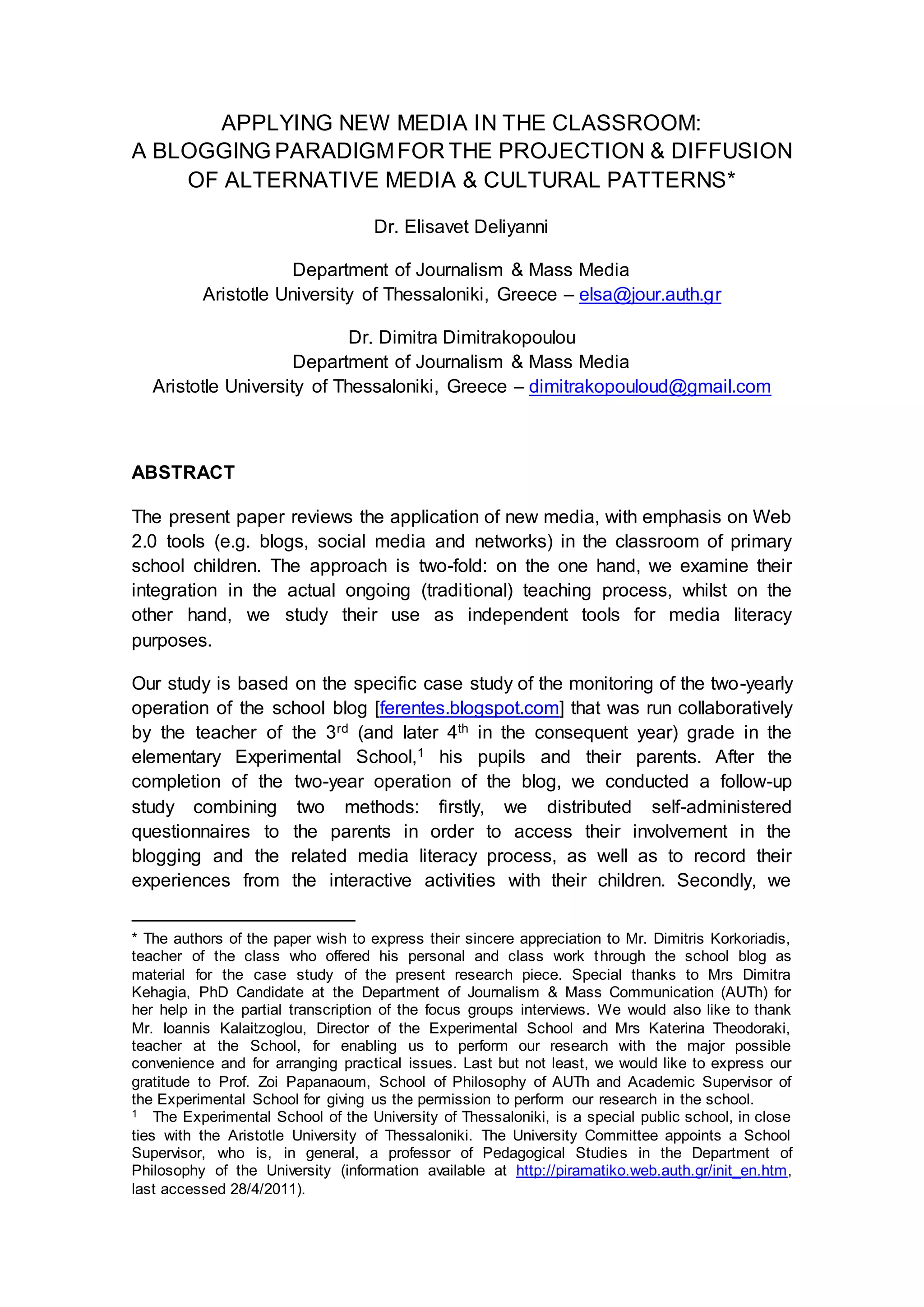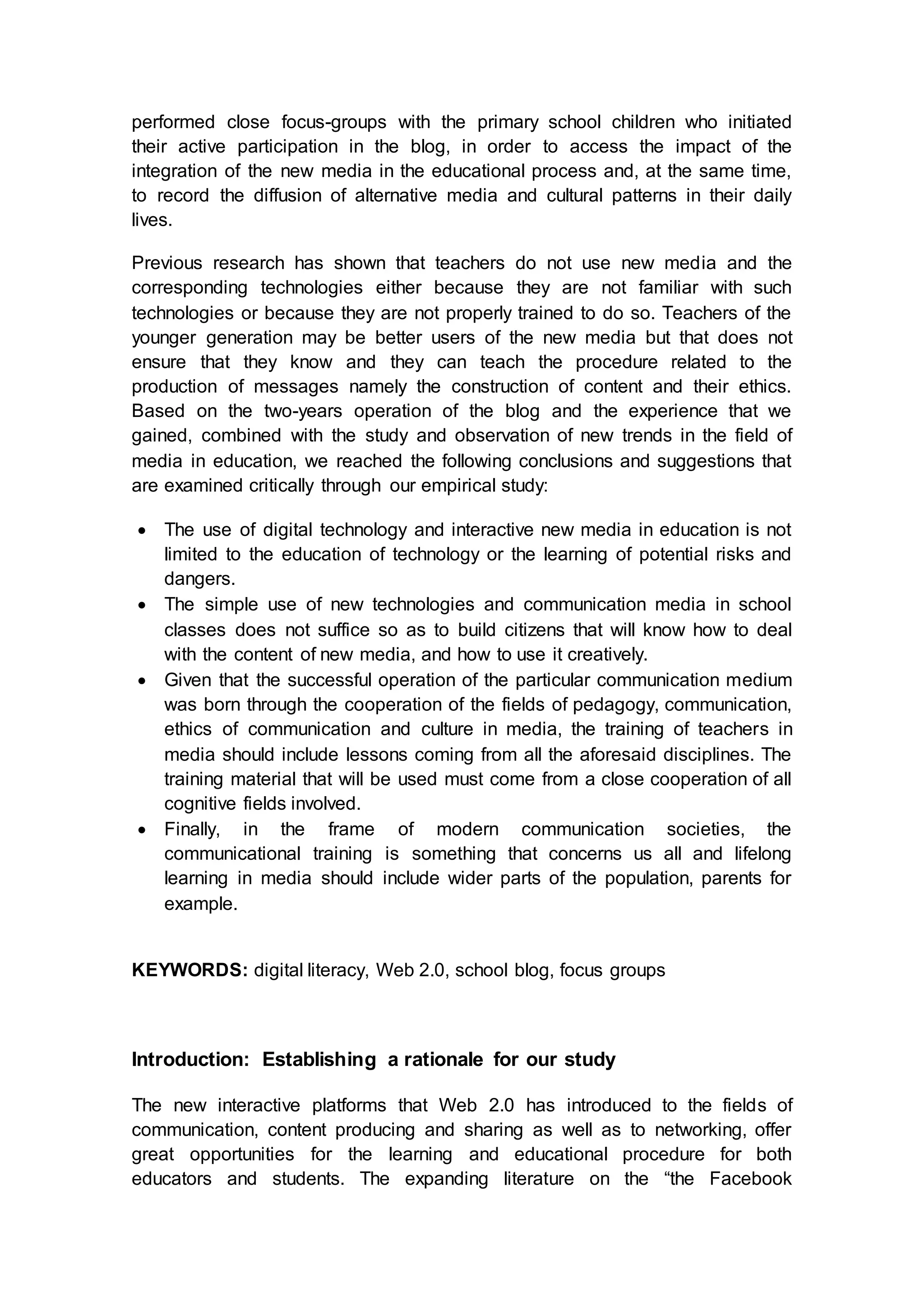 This document discusses applying new media tools like blogs and social media in primary school classrooms. It summarizes a case study of a school blog run collaboratively by a teacher, students, and parents over two years. Surveys of parents and focus groups with students found that the blog had positive impacts. It engaged students and parents in media literacy activities and diffusion of alternative media patterns. However, teachers need proper training to effectively integrate new media into teaching and develop students' digital literacy skills. The emergence of Web 2.0 requires new approaches to learning that are collaborative, learner-centered, and personalized.