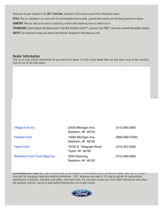 The document provides information about the 2011 Ford Flex, including its style, comfort, technology, and safety features. It highlights the Flex's distinctive exterior styling, ample legroom and seating for up to seven passengers, standard safety features like six airbags, and available smart technologies such as AdvanceTrac, Ford SYNC, and navigation. Power options include a standard 3.5L V6 engine or available high-performance 3.5L EcoBoost V6 twin-turbocharged engine.