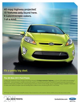 The all-new 2011 Ford Fiesta offers a class-leading highway fuel economy of 40 MPG and includes 15 exclusive features such as a 4-inch LCD multifunctional display and Ford Sync voice-activated connectivity. Available in both hatchback and sedan models, it combines style, safety with seven standard airbags, and responsive handling from advanced suspension systems. This vehicle aims to enhance the driving experience with its intelligent design, offering both comfort and efficiency.