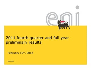 This document summarizes Eni's preliminary fourth quarter and full year 2011 results. Key highlights include: