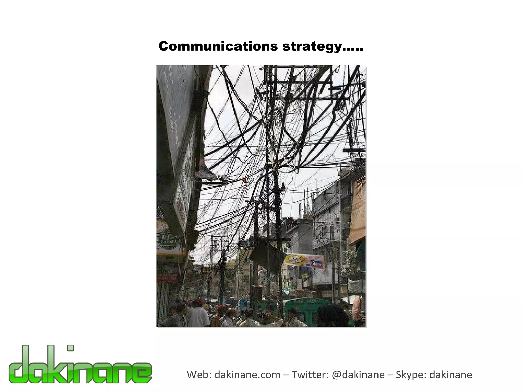 The document discusses strategies for using social media for communications. It recommends choosing social media tools based on goals and audience. It also discusses using RSS feeds and aggregation websites to curate content from various sources and distribute it across social networks. The document also recommends linking social media accounts to help manage workflows and automate notifications when new content is posted.