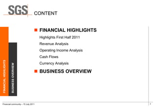SGS Group reported financial results for the first half of 2011. Total revenue grew 12.8% at constant currency rates to CHF 2.3 billion, driven by 9.7% organic growth and acquisitions contributing 3.1%. Adjusted operating income increased 12.0% at constant currency rates to CHF 374 million, with the margin remaining stable at 16.0%. The company expects solid top line growth of over 10% for 2011 along with increased investments lowering operating margins slightly compared to 2010.