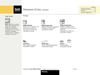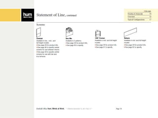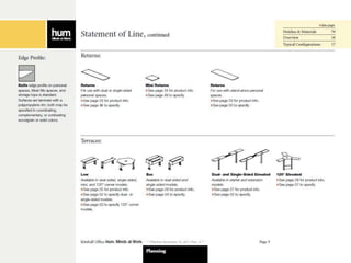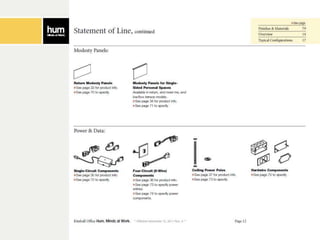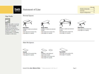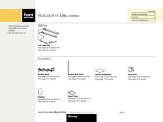 The document outlines instructions for creating customized workspace configurations using the Hum furniture system, highlighting elements such as personal workspaces, terraces, screens, and storage options. It details a step-by-step process for selecting components, including power and data components, and provides specific page references for further information. Kimball Office is presented as a resource for integrated furniture solutions across various workplace environments.