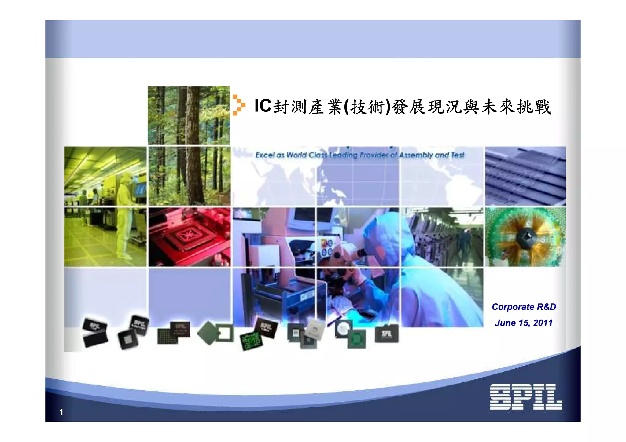 This document discusses trends in the IC packaging industry and technology. It provides an overview of the market growth in IC packaging units and revenues. Key challenges for the industry are declining ASPs and increasing materials costs. Emerging technologies discussed include wafer-level packaging, 2.5D/3D IC with TSV, and integrated passives. The document outlines SPIL's packaging portfolio and roadmaps for 3D IC and TSV development over the next few years. It also summarizes SPIL's testing and certification capabilities.