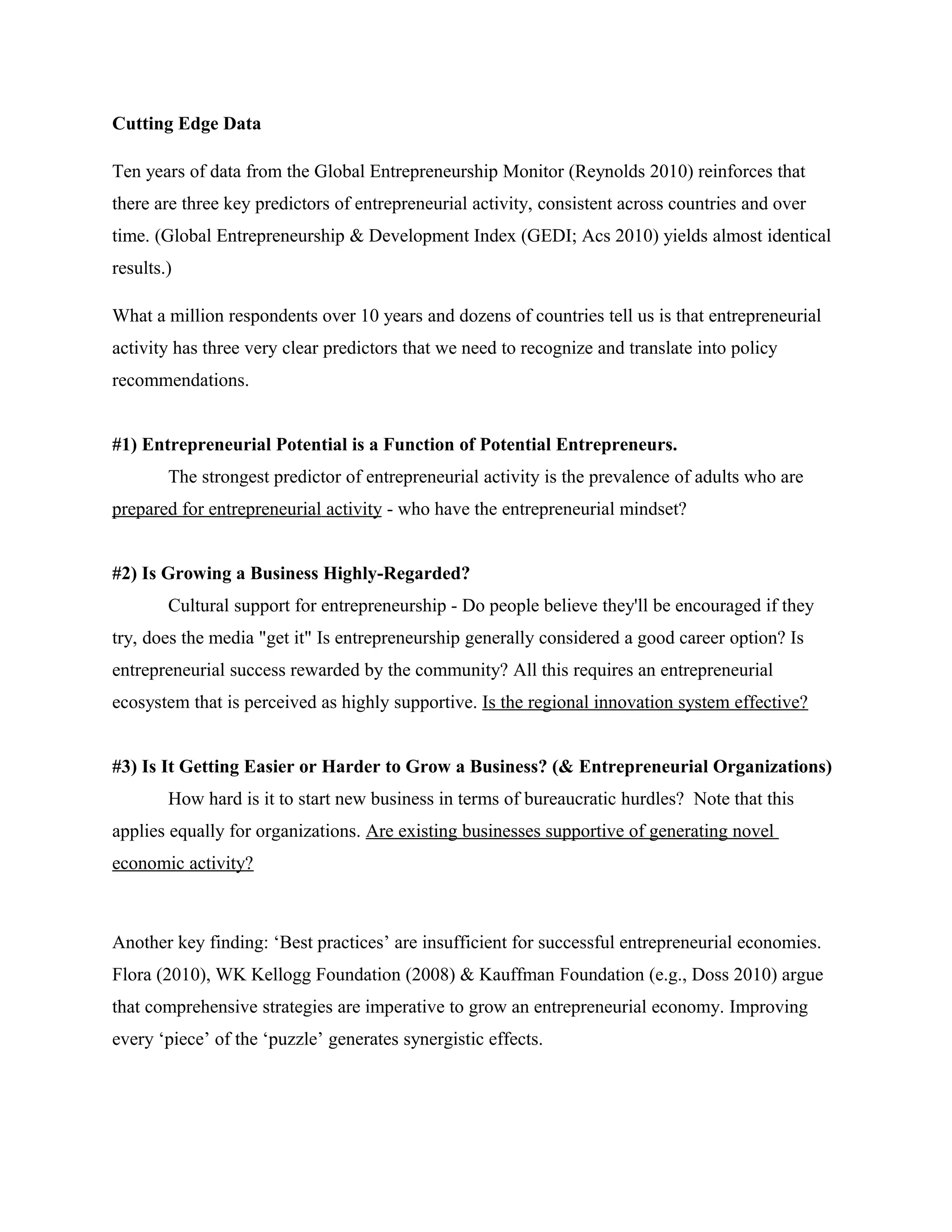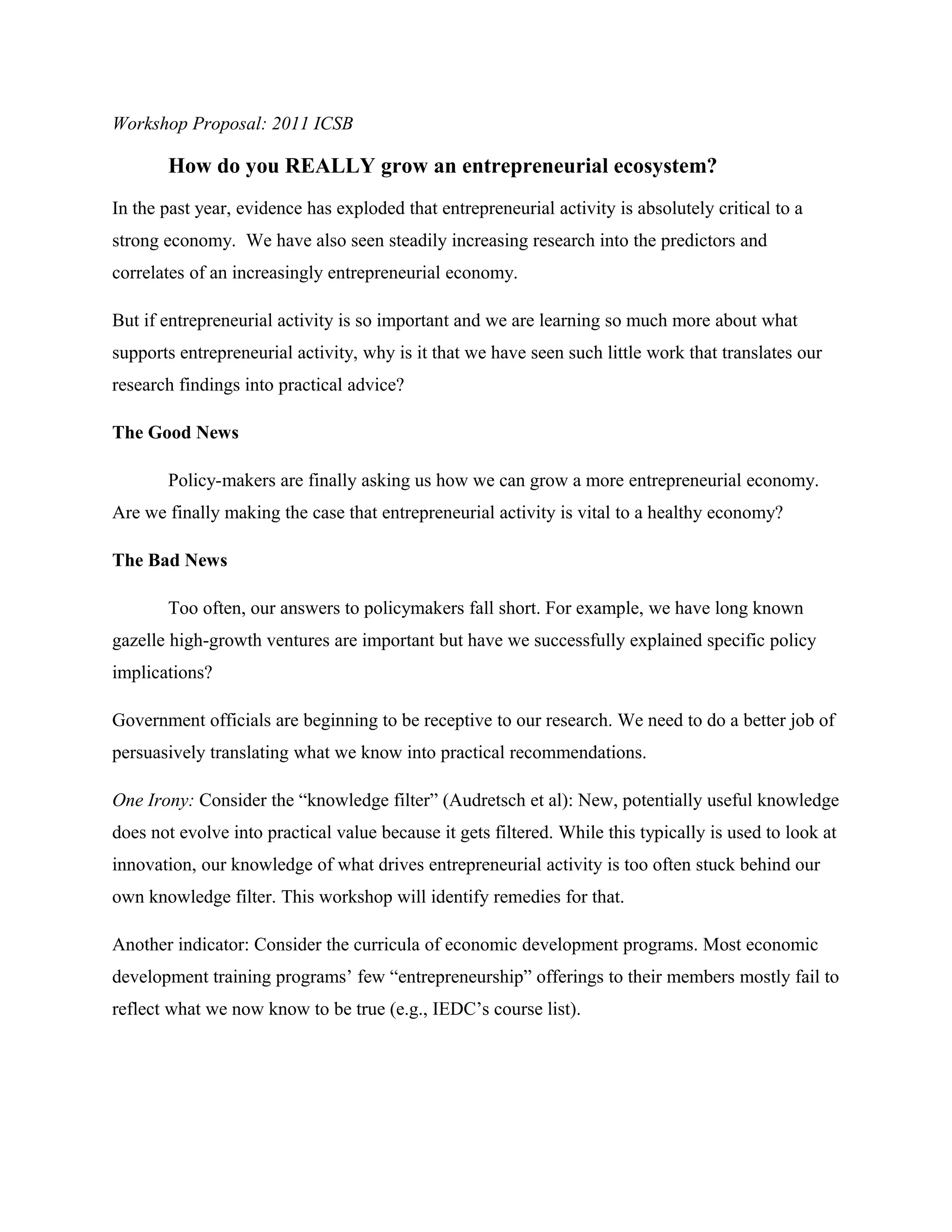 The workshop proposal for the 2011 ICSB conference focuses on translating research about fostering entrepreneurial activity into practical policy recommendations for economic development. It identifies three key predictors of entrepreneurial activity: the preparedness of potential entrepreneurs, cultural support for entrepreneurship, and the ease of growing a business. The workshop aims to convene experts to discuss comprehensive strategies and necessary changes in policy to create more supportive entrepreneurial ecosystems.
