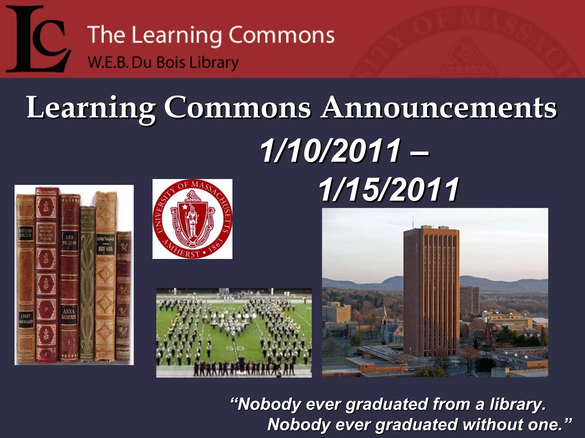 The document provides announcements for the Learning Commons at UMass Amherst from January 10-15, 2011. It highlights new and expanded services at the Circulation/Reserves desk, study abroad advising, streaming video collections, exhibits, the addition of the Office of Undergraduate Research and Scholarship as a new service provider, parking validation, social media presence, lost and found services, remote assistance from librarians, poster printing, wireless access, laptop policies during fire alarms, printing tips, research guides, and tutoring services.