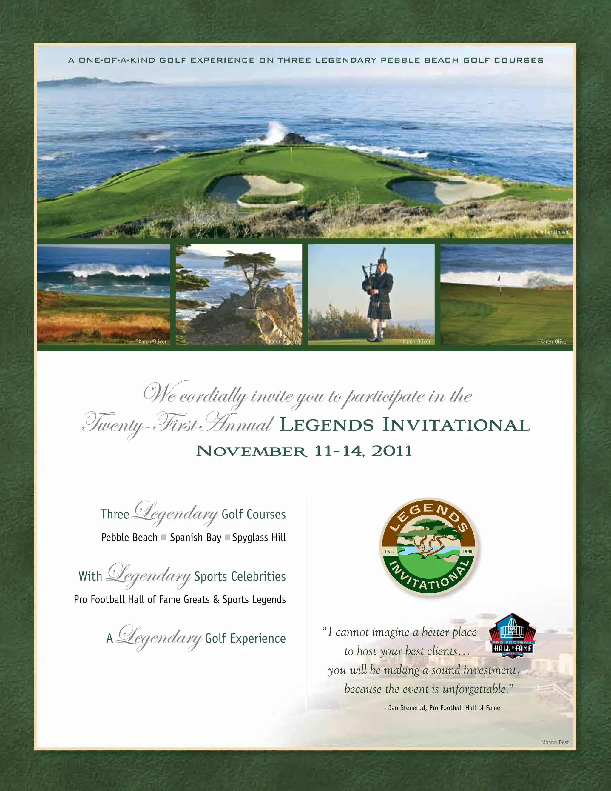 The document describes the Legends Invitational Golf Tournament, which takes place annually at Pebble Beach Resorts in California. It is a 4-day tournament that pairs celebrity captains who are former NFL players with corporate executives and others to form 5-person teams. The teams play golf over 3 days at Pebble Beach, Spanish Bay, and Spyglass Hill golf courses. The event also includes evening entertainment and donations to the Boys and Girls Club of Monterey County. The document provides sponsorship packages for the event at different contribution levels, each including golf access and recognition benefits.
