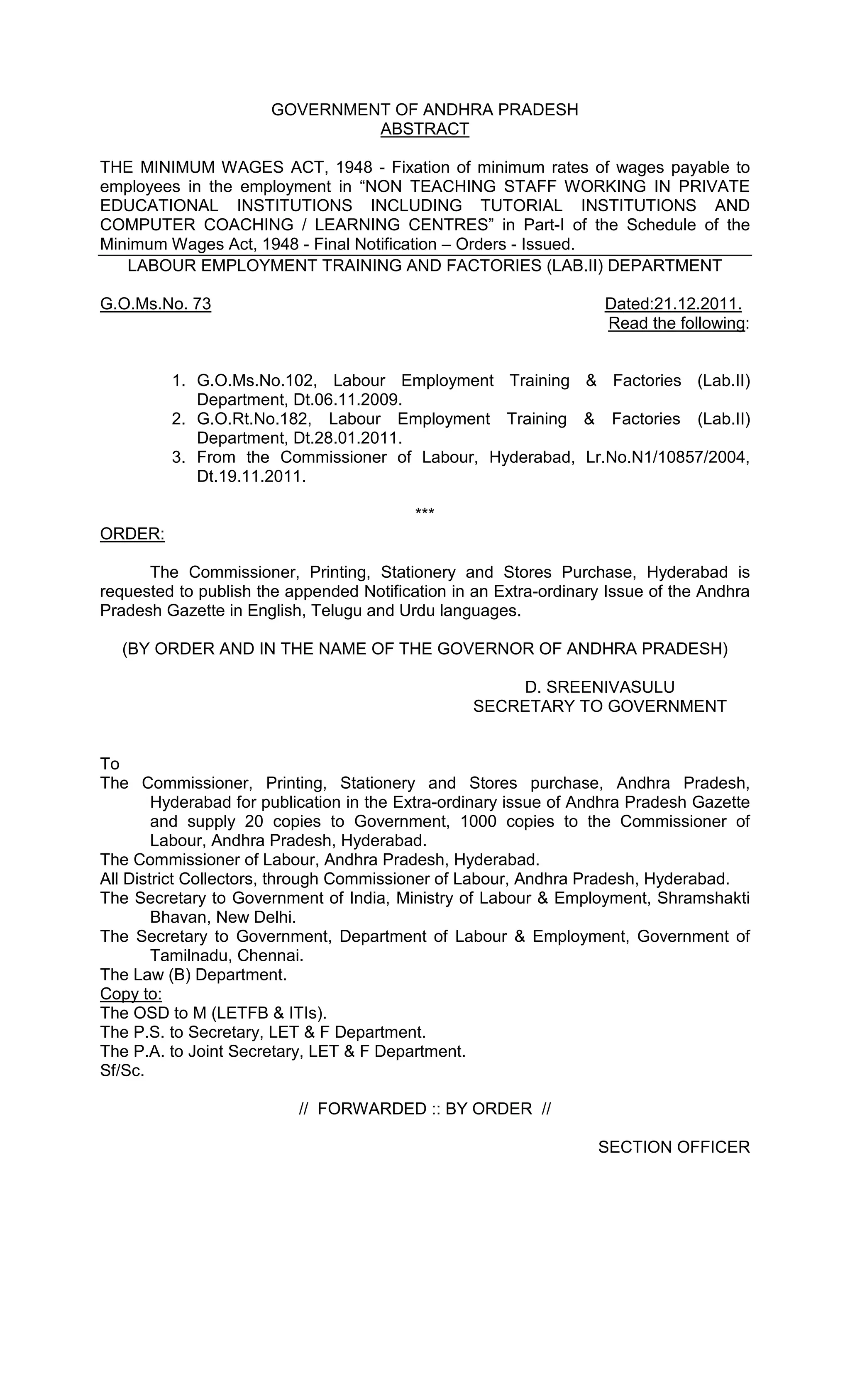 This document fixes the minimum wage rates for non-teaching staff working in private educational institutions in Andhra Pradesh. It outlines 7 categories of employees and specifies the basic minimum wage for each in Zones I and II. Cost of living allowances are also provided to account for increases in the consumer price index above 847 points. The new wage rates are to come into force upon publication of this final notification in the Andhra Pradesh Gazette.
