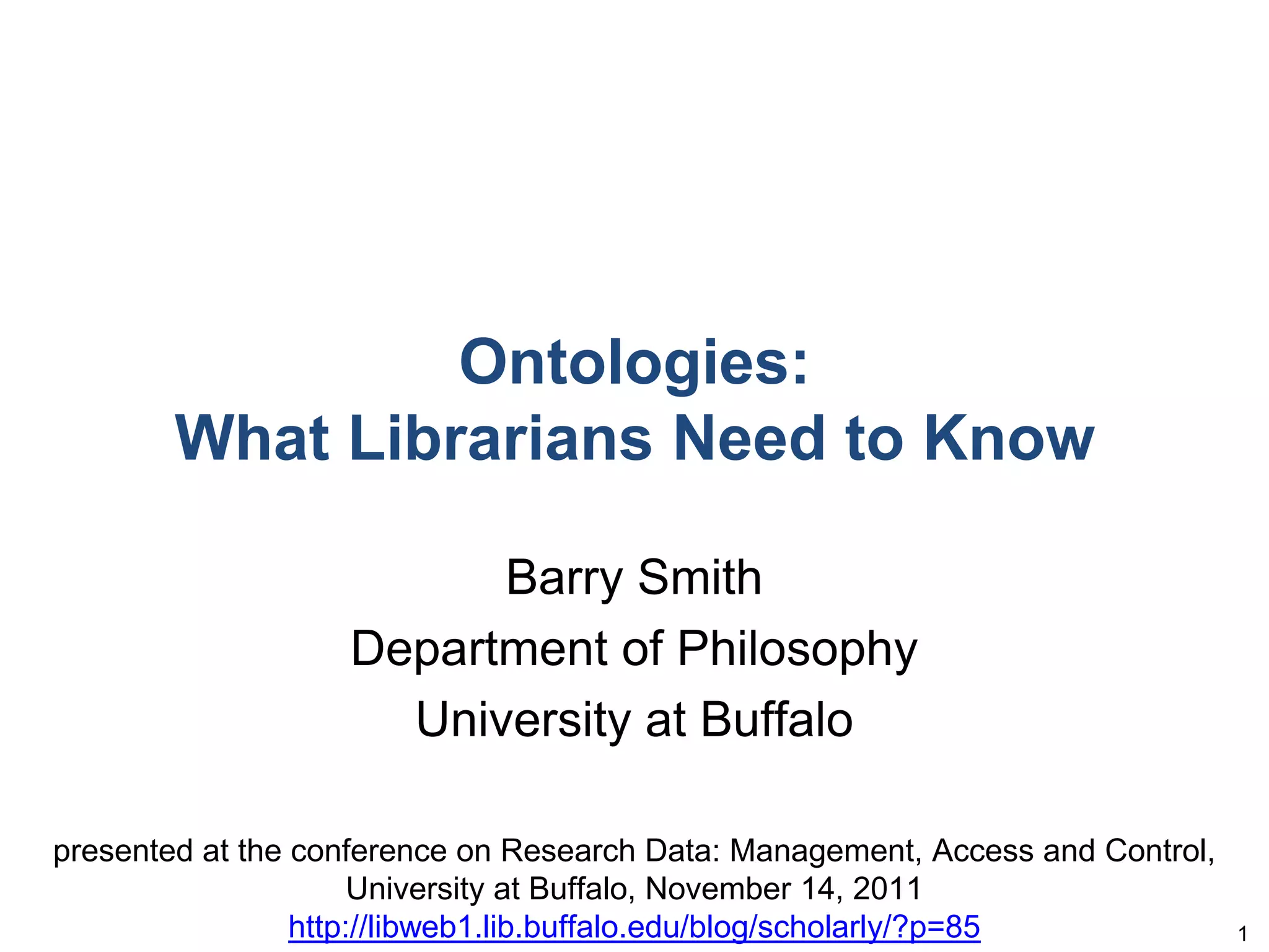 Barry Smith presented on ontologies and what librarians need to know about them. Ontologies provide controlled vocabularies that can be used to tag and annotate data in order to integrate datasets and avoid data silos. The Gene Ontology is highlighted as a successful ontology due to factors such as being developed and maintained by domain experts according to best practices, having over 11 million annotations linking genes to ontology terms, and enabling new types of biological research through analysis and comparison of massive quantities of annotated data. For ontologies to fully realize their potential to remove data silos, they must be prospectively standardized and evolved based on user feedback.