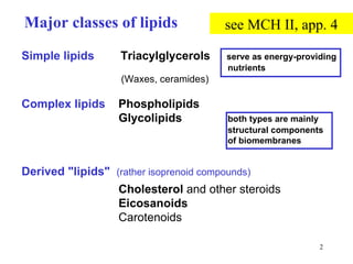 The document summarizes key aspects of lipid metabolism. It discusses the major classes of lipids including triacylglycerols and phospholipids. It then covers the metabolism of triacylglycerols including digestion, absorption, transport, and breakdown through beta-oxidation. Beta-oxidation takes place in the mitochondria and involves activating fatty acids to acyl-CoA derivatives, transporting long-chain acyl-CoAs into the mitochondrial matrix using carnitine, and breaking the acyl-CoA into acetyl-CoA through a repeating four-step cycle.