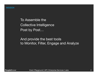 PeopleBrowsr is a social analytics company that assembles collective intelligence from public social media posts to provide tools for monitoring, filtering, engaging with, and analyzing conversations. Its mission is to index every public human conversation to measure influence, community detection, and sentiment analysis. It offers services for enterprises to identify influential brand ambassadors and design social media campaigns, as well as tools for individuals to discover new relationships and conversations of interest.