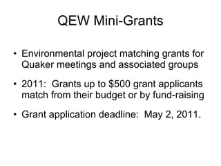 The document announces Quaker Earthcare Witness Mini-Grants for 2011 that provide matching funds up to $500 for environmental projects by Quaker meetings and associated groups. It provides examples of previous projects funded, including edible playground gardens, canoe trips educating about sustainability, invasive plant removal and restoration, school gardens, green roofs, drip irrigation, solar energy projects, and more. It encourages contributions to the mini-grant fund and applications for the May 2, 2011 deadline.
