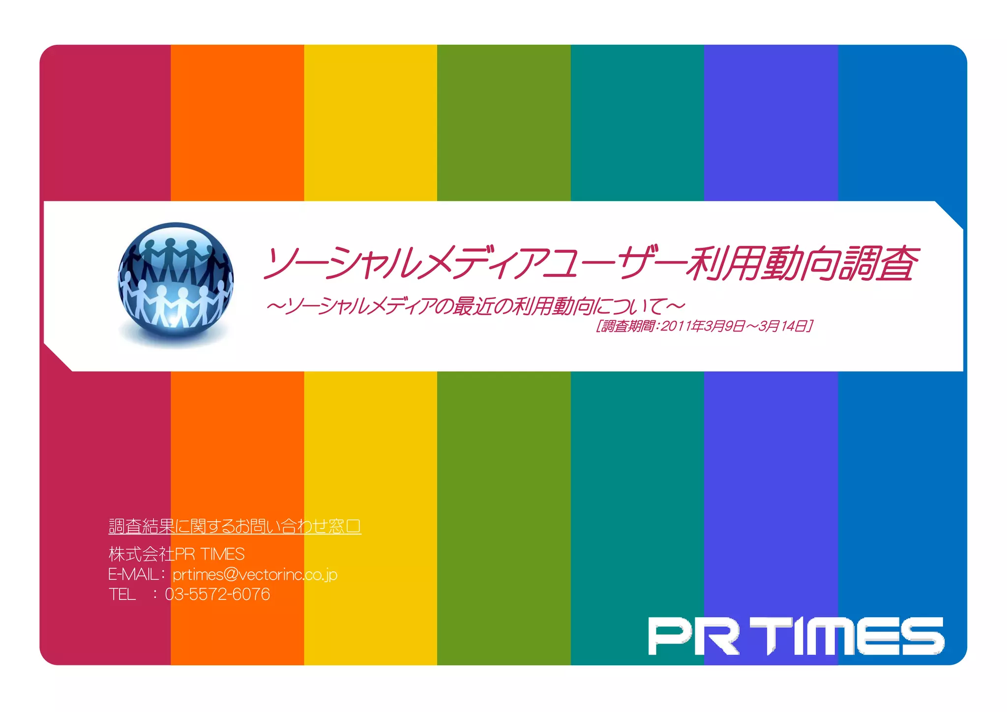 利用動向調査 ソーシャルメディアユーザー利用動向調査 ~ソーシャルメディアの最近の利用動向について~ [調査期間:2011年 [調査期間:2011年3月9日~3月14日] 日~3 14日] 調査結果に関するお問い合わせ窓口 株式会社PR TIMES E-MAIL: prtimes@vectorinc.co.jp TEL : 03-5572-6076 03 5572 6076
