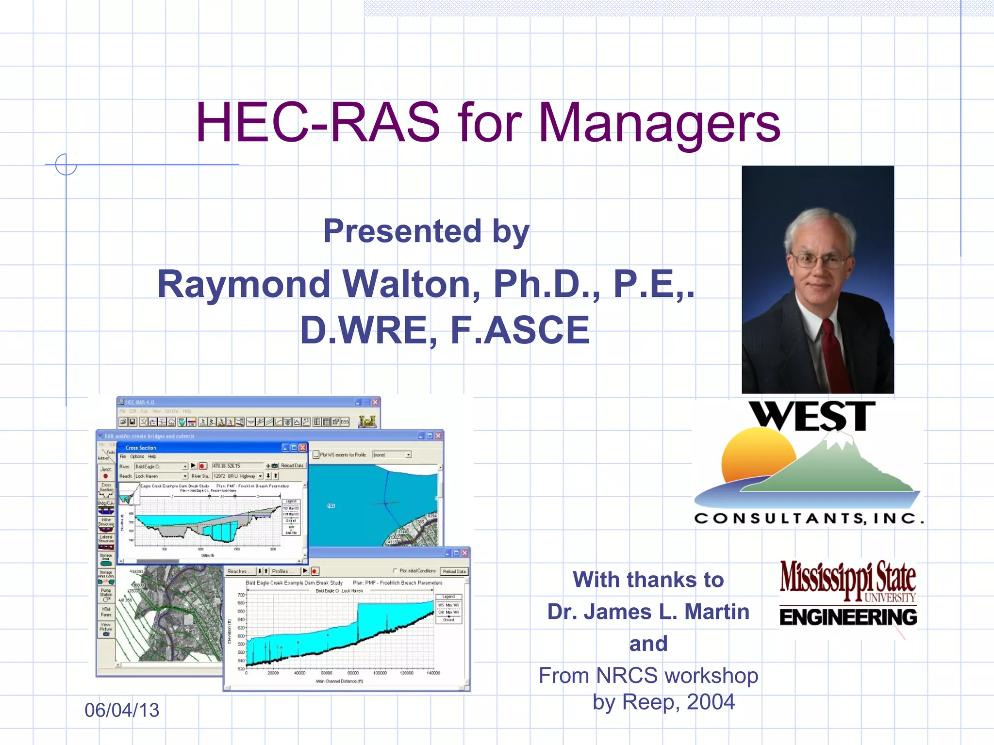 This document provides an overview of a presentation on using the HEC-RAS hydraulic modeling software for managers. It discusses the benefits of understanding hydraulic modeling including for planning, risk reduction, and environmental assessments. It also outlines the agenda which will define key hydraulic and modeling concepts, explain what HEC-RAS is and what it can be used for, what is needed to use it, concerns for managers, and where to find help. The presentation will provide managers with a basic understanding of HEC-RAS and its uses.