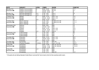 This document provides a schedule of estimate examinations taking place from November 15th to 25th, 2011. It lists the date, subject, level, time, room, and number of candidates for each exam. Exams will be held in various rooms like the gym, classrooms, and computer labs. Subjects include English, maths, accounting, languages, science, humanities, computing, and more. The schedule provides organization and logistical details to help facilitate the exams over the two-week period.
