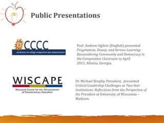 The document summarizes presentations, research projects, exhibitions, awards and field work by faculty and students at Marymount College. It describes projects and presentations by Professors Ogilvie, Brophy, Earle, Masri and Royal as well as exhibitions by Professor Vanderpool. It also lists current research projects by Professors McMahon, Ogilvie, Zanca, Royal, Earle, Sellar, Vanderpool, Levonian, Masri and Royal. Student research projects and award nominees are also mentioned. Photos show Professor Earle working in the field and research by Professor Zanca and an exhibition by Professor Vanderpool.