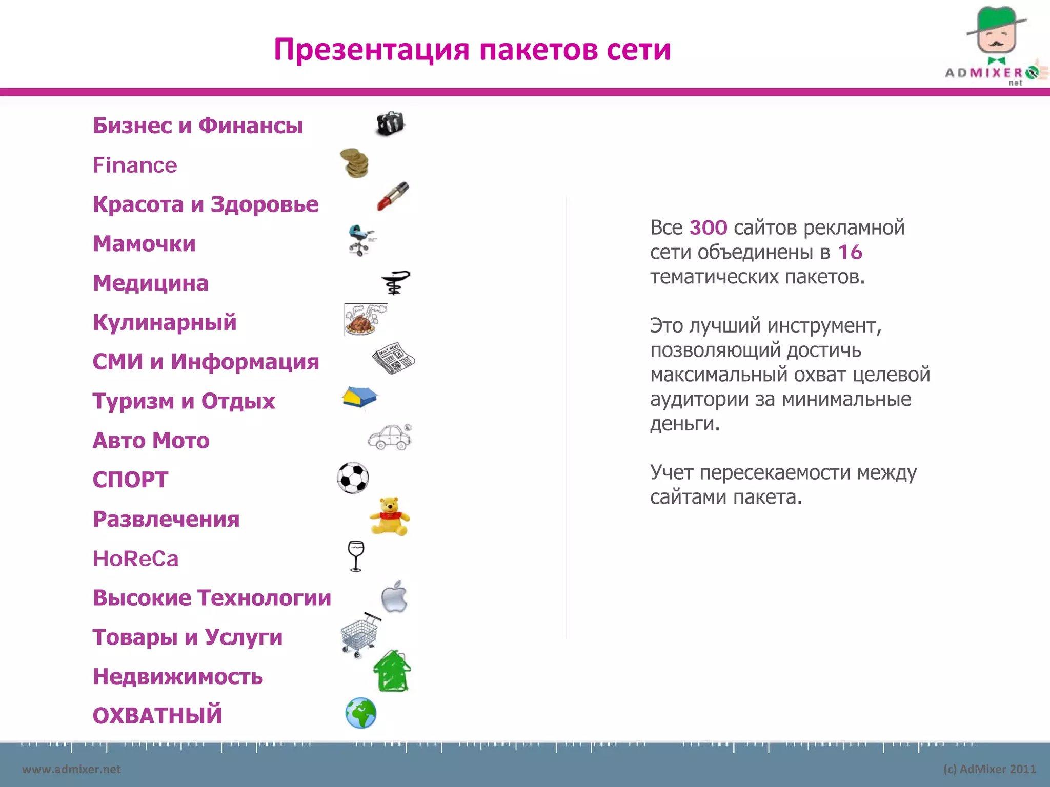 Документ представляет собой обзор рекламной сети, объединяющей 300 сайтов в 16 тематических пакетах, охватывающих разные сферы, такие как бизнес, финансы, красота, здоровье и другие. Описываются демографические характеристики пользователей по возрасту, полу, уровню образования и доходу. Источник данных — аудитория Gemius за май 2011 года.