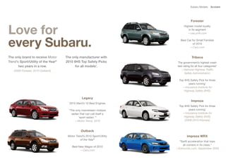 The document is a 2011 Subaru models brochure that summarizes key features and specifications for various Subaru vehicle models including Legacy, Outback, Forester, Tribeca, Impreza, Impreza WRX, and Impreza WRX STI. It highlights attributes such as available engines, safety ratings, cargo capacity, technology features, and environmental credentials. Specifications like fuel economy, ground clearance, audio systems, and trim levels are provided for each model. The brochure also discusses Subaru's commitment to environmental responsibility and owner value.