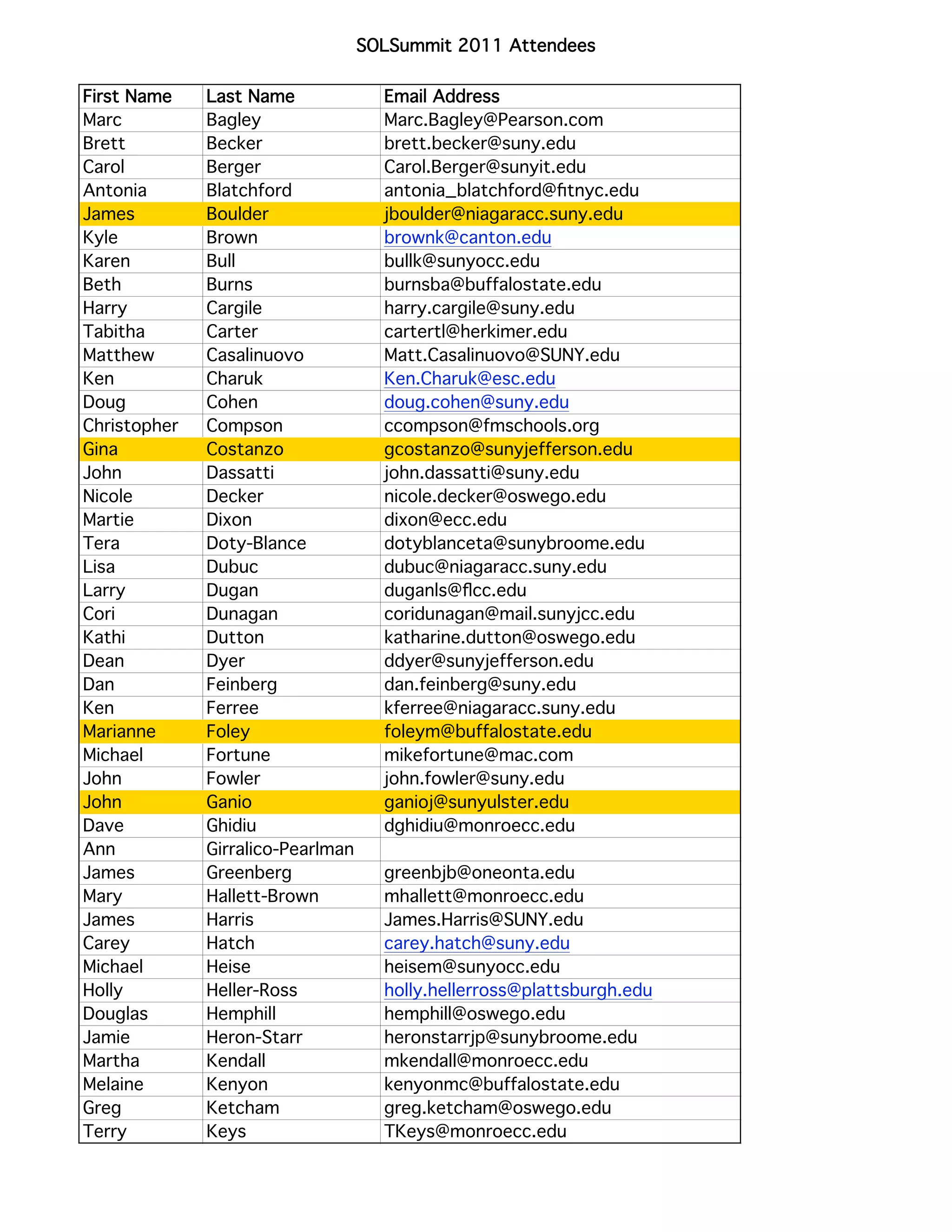 The document lists attendees of the SOLSummit 2011 conference including their name, email address, company or campus affiliation. There were over 100 attendees from SUNY campuses and colleges, as well as a few from other institutions like Pearson eCollege and Seattle Pacific University. The attendees represented a variety of roles from librarians and instructors to administrators from areas like the SUNY Learning Network and individual SUNY campuses.