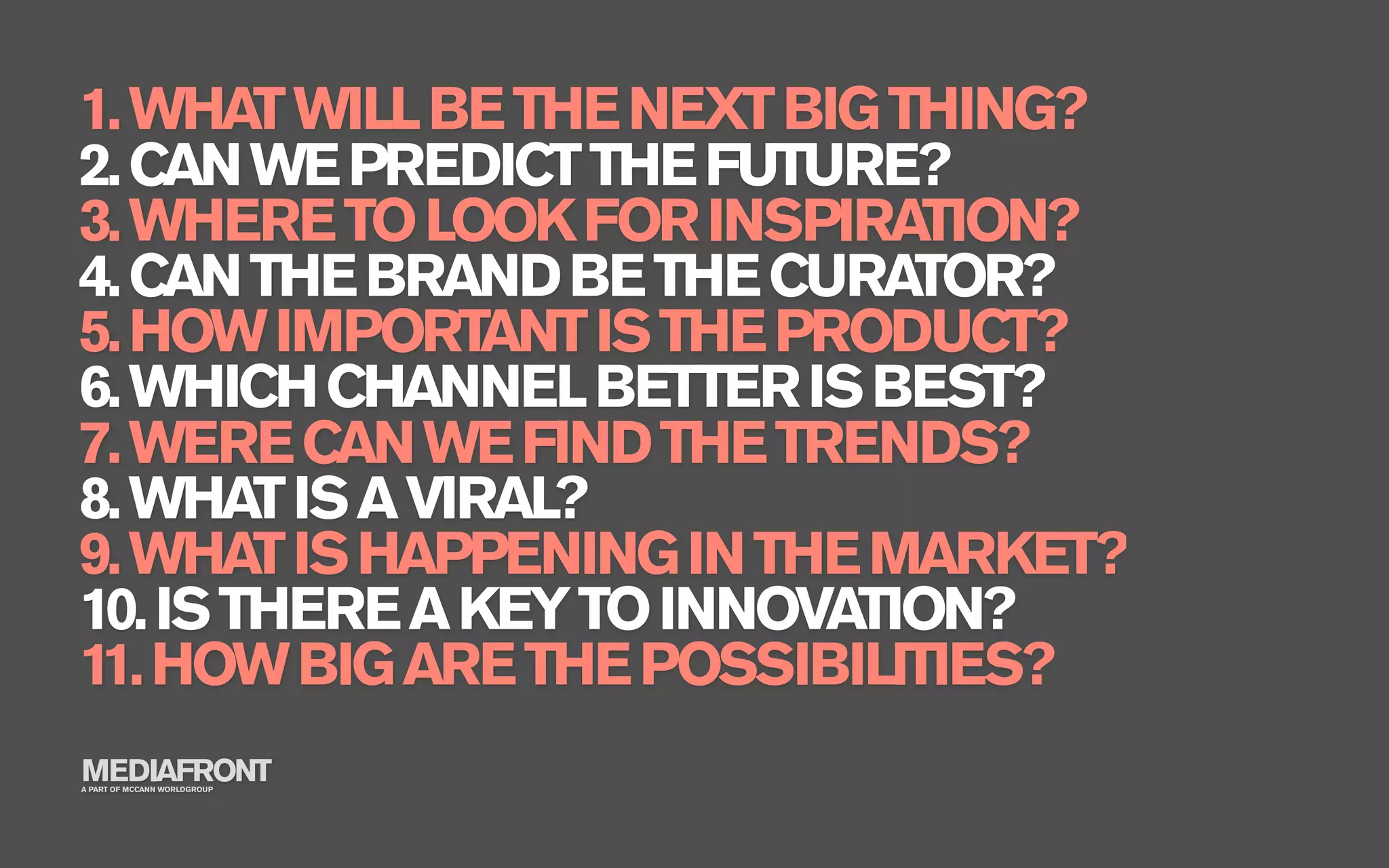 The document discusses key considerations for brands and marketers in 2011, emphasizing the unpredictability of future trends and the importance of creativity and innovation. It highlights the role of brands as curators of information, the significance of product quality, and the evolving channels for communication with consumers. Additionally, it draws parallels between academic achievement and brand development, urging marketers to remain curious and open to inspiration across diverse fields.