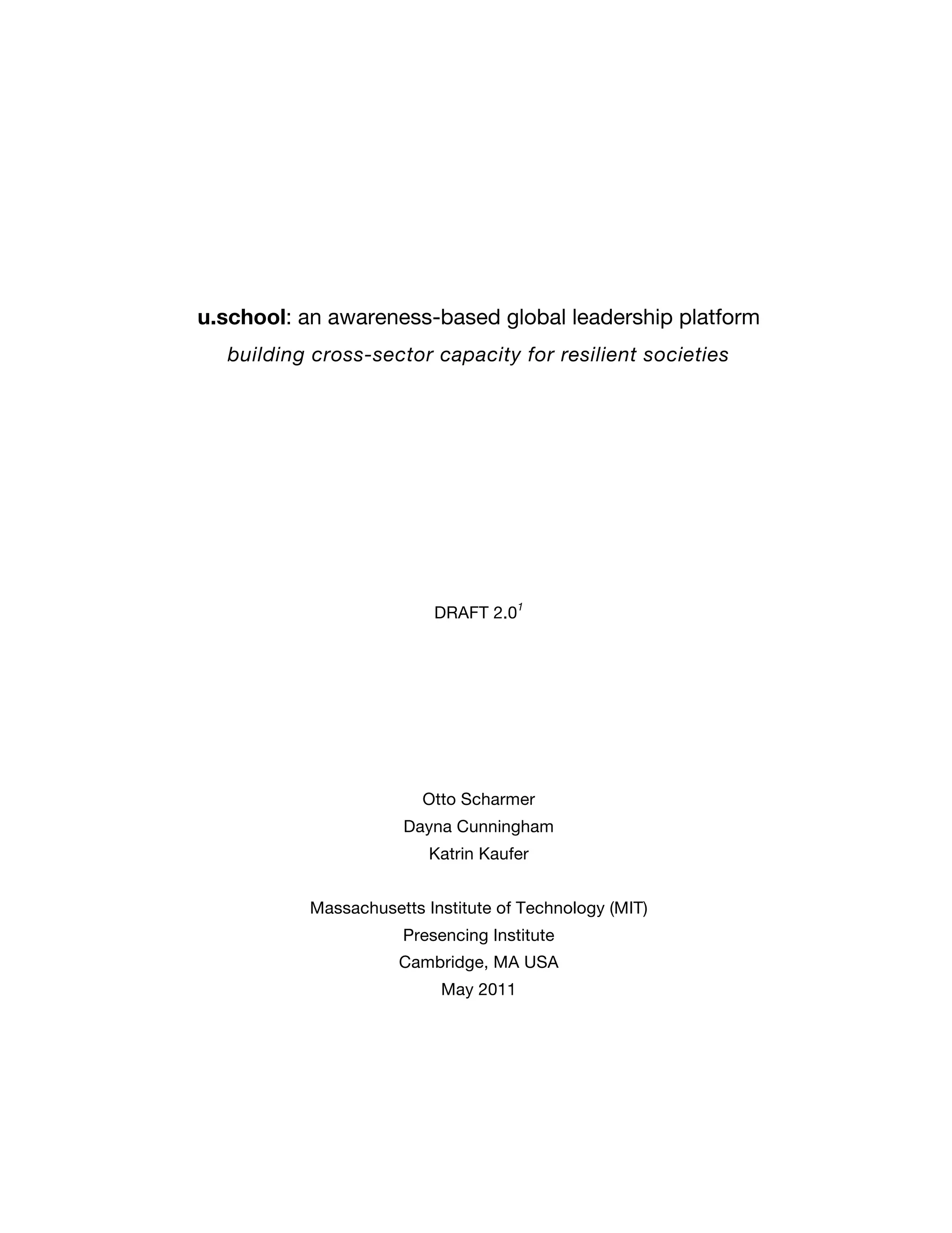 This document proposes the creation of a global leadership platform called u.school. The u.school will engage leaders across sectors, cultures, and generations to address societal challenges through innovation. It will use awareness-based practices and multi-stakeholder collaboration. The u.school will include global networks of hubs, leadership programs, and "innovation labs" focused on areas like food, health, education, cities, and banking. Its goals are to build collective leadership capacity, generate new solutions through prototyping, and create systemic change toward resilience and well-being for all.