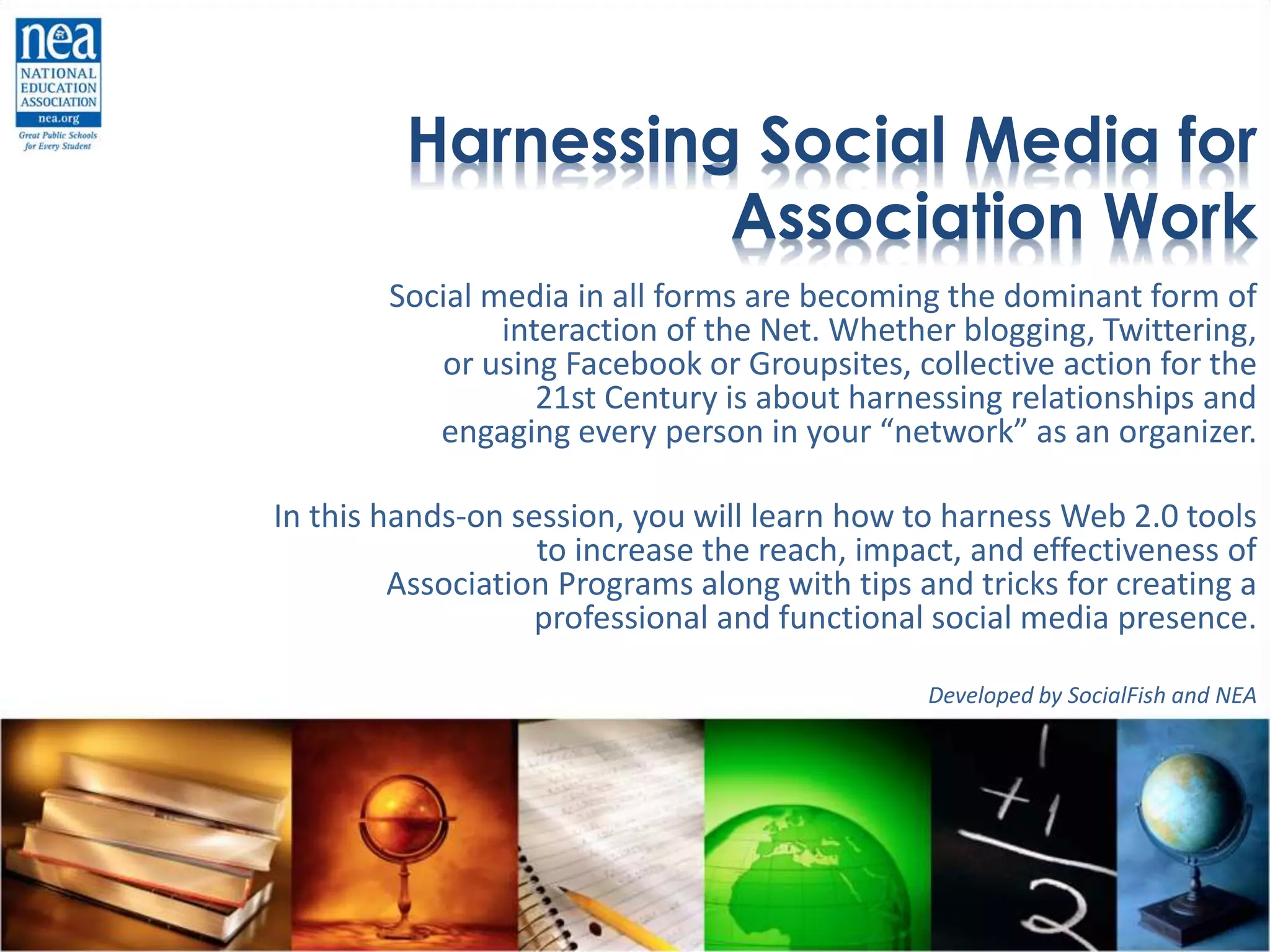 This document discusses harnessing social media for association work. It explains that social media like blogging, Twitter, Facebook, and online groups are becoming dominant forms of online interaction. It states that collective action in the 21st century involves harnessing relationships and engaging one's entire network as organizers. The document then provides an in-person session to teach how to use Web 2.0 tools like these to increase the reach, impact, and effectiveness of association programs, along with tips for creating an effective professional social media presence.