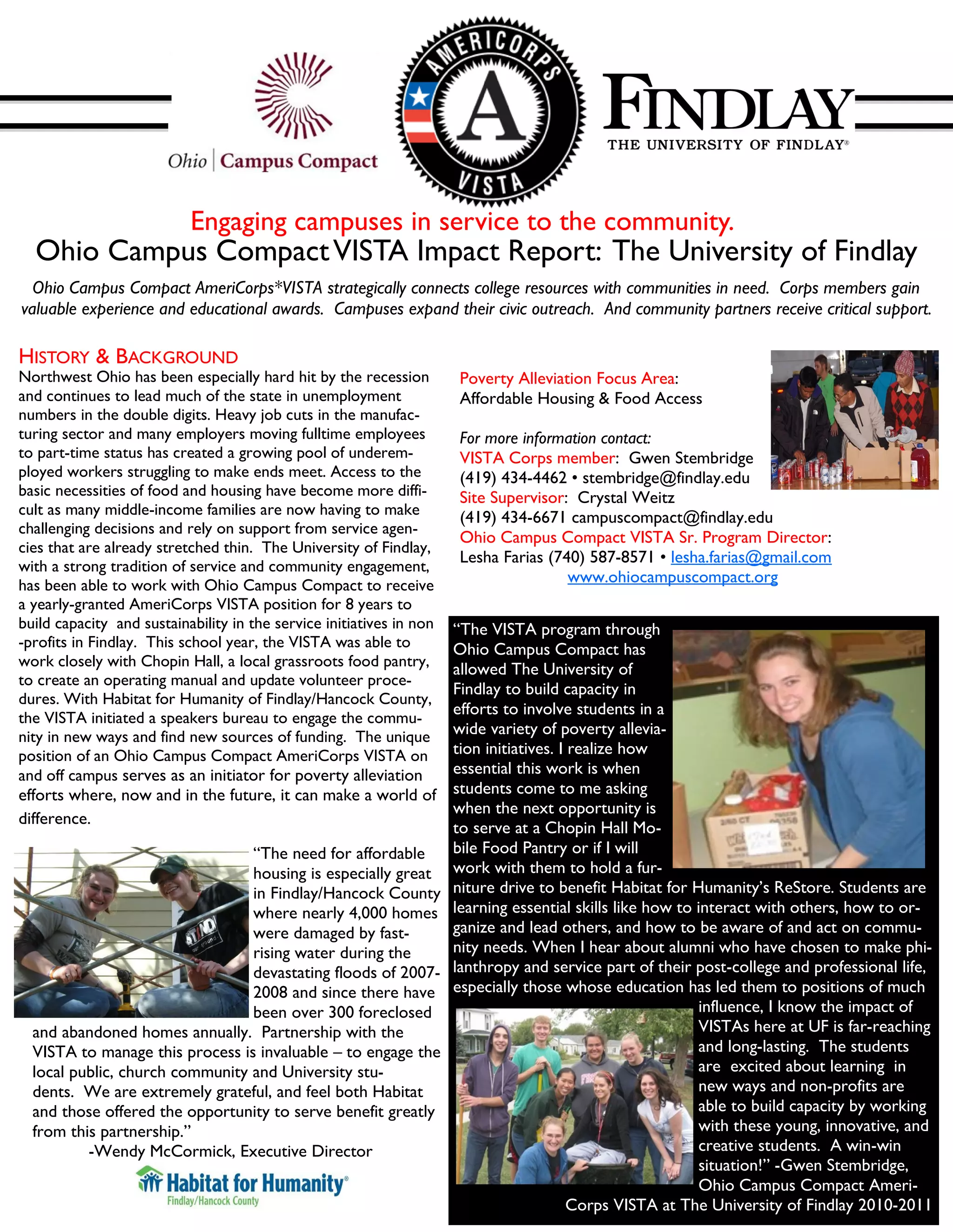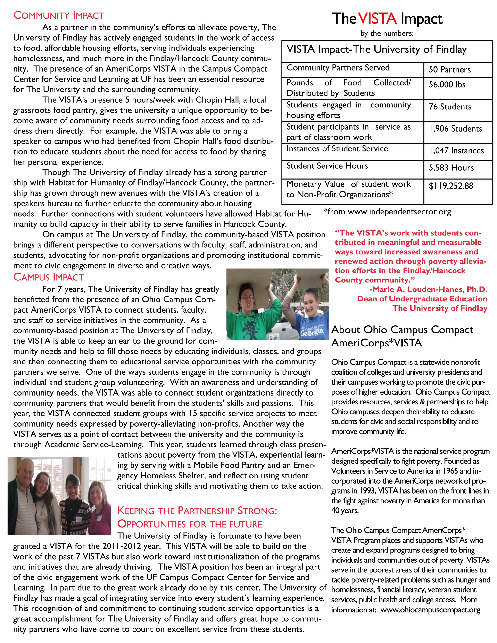 The Ohio Campus Compact AmeriCorps VISTA program places corps members at universities to connect campus resources with community needs and help non-profits address poverty. At the University of Findlay, the VISTA member has helped local food pantries and Habitat for Humanity by creating operating manuals, updating procedures, and initiating community engagement efforts. Through these partnerships, over 1,900 students have provided nearly 6,000 hours of service valued at $119,000 to address issues like affordable housing, food access, and homelessness in the surrounding community.