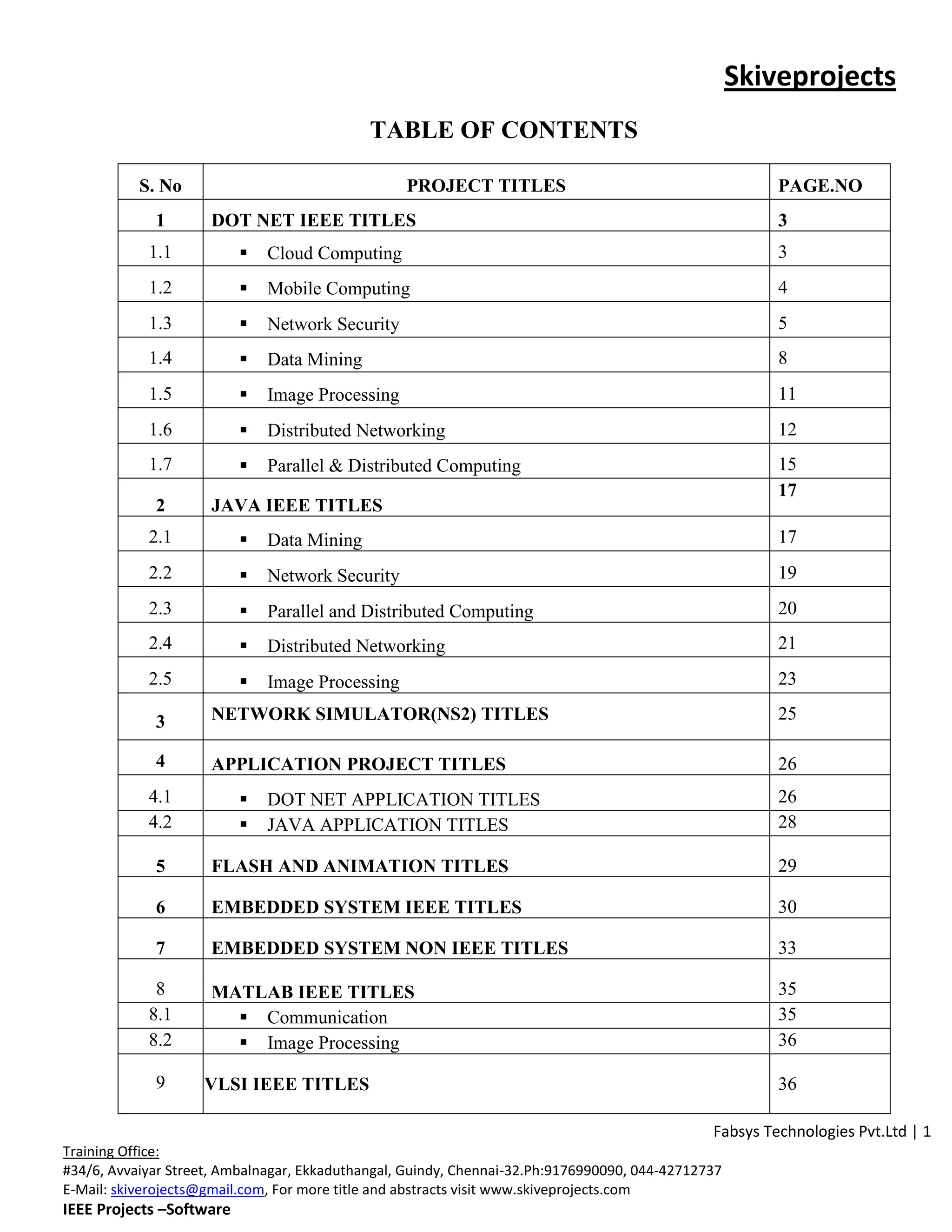 The document contains a table of contents listing various project titles related to different technologies like Dot NET, Java, Network Simulator (NS2), embedded systems, MATLAB etc. It then provides a brief introduction about the organization called Skiveprojects which provides guidance and training for student projects. It lists some benefits of doing IEEE projects for final year students. It also mentions that they can help develop custom projects according to students' requirements. The first section focuses on Dot NET IEEE titles related to cloud computing and lists 7 project titles along with their codes, descriptions, technologies used and application areas.