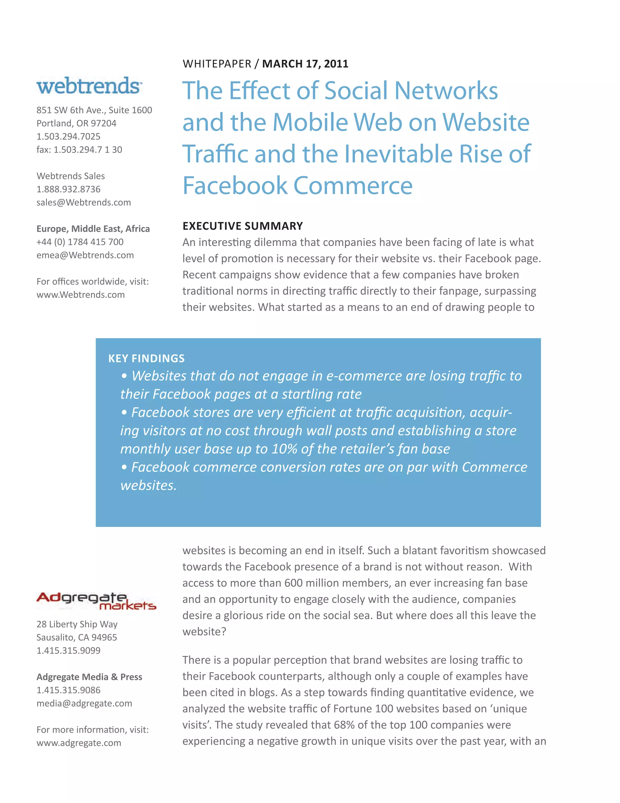 This whitepaper discusses the declining traffic to brand websites in favor of Facebook pages, particularly highlighting that 68% of Fortune 100 companies experienced a decrease in unique visits, with non-e-commerce sites losing out significantly to their Facebook counterparts. The study shows that brands are increasingly engaging in Facebook commerce, which effectively acquires traffic at low costs, while mobile web usage is also on the rise, further challenging traditional websites. It concludes that businesses must adapt to these changes by leveraging social and mobile channels to maintain online presence and performance.