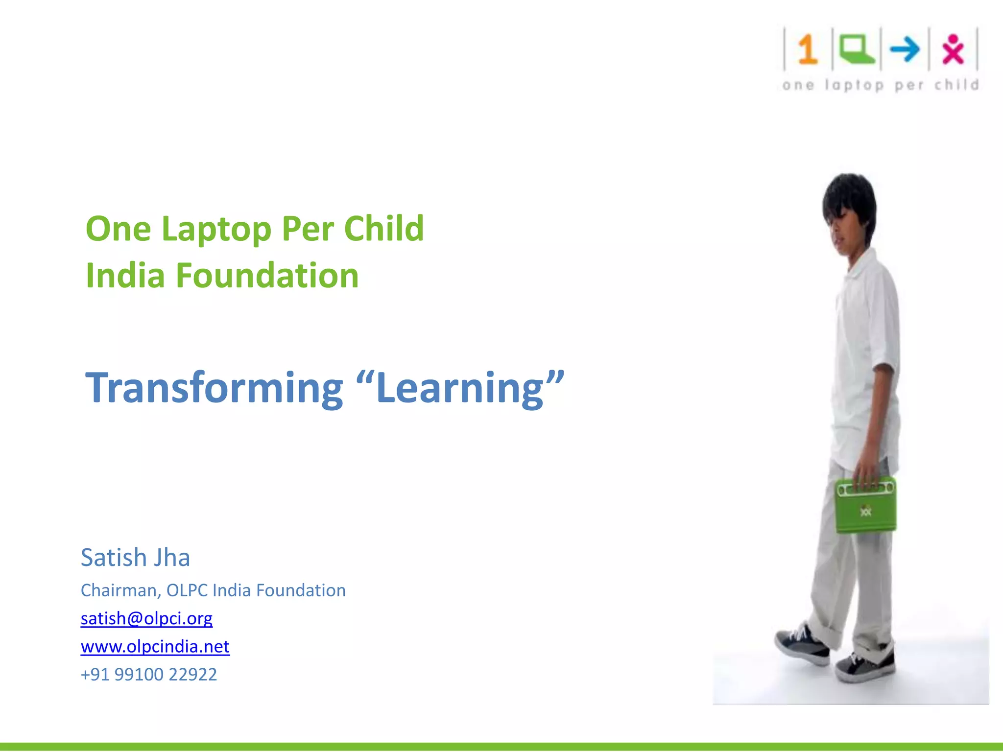 The One Laptop per Child (OLPC) initiative aims to address the educational needs of underprivileged children in India by providing affordable, rugged laptops designed for collaborative and self-empowered learning. Despite significant challenges in the current educational system, OLPC seeks to deliver transformational educational tools that are financially viable and suitable for local contexts. The project has expanded globally since 2007, with successful deployments in numerous countries, showcasing its impact on enhancing children's learning experiences.