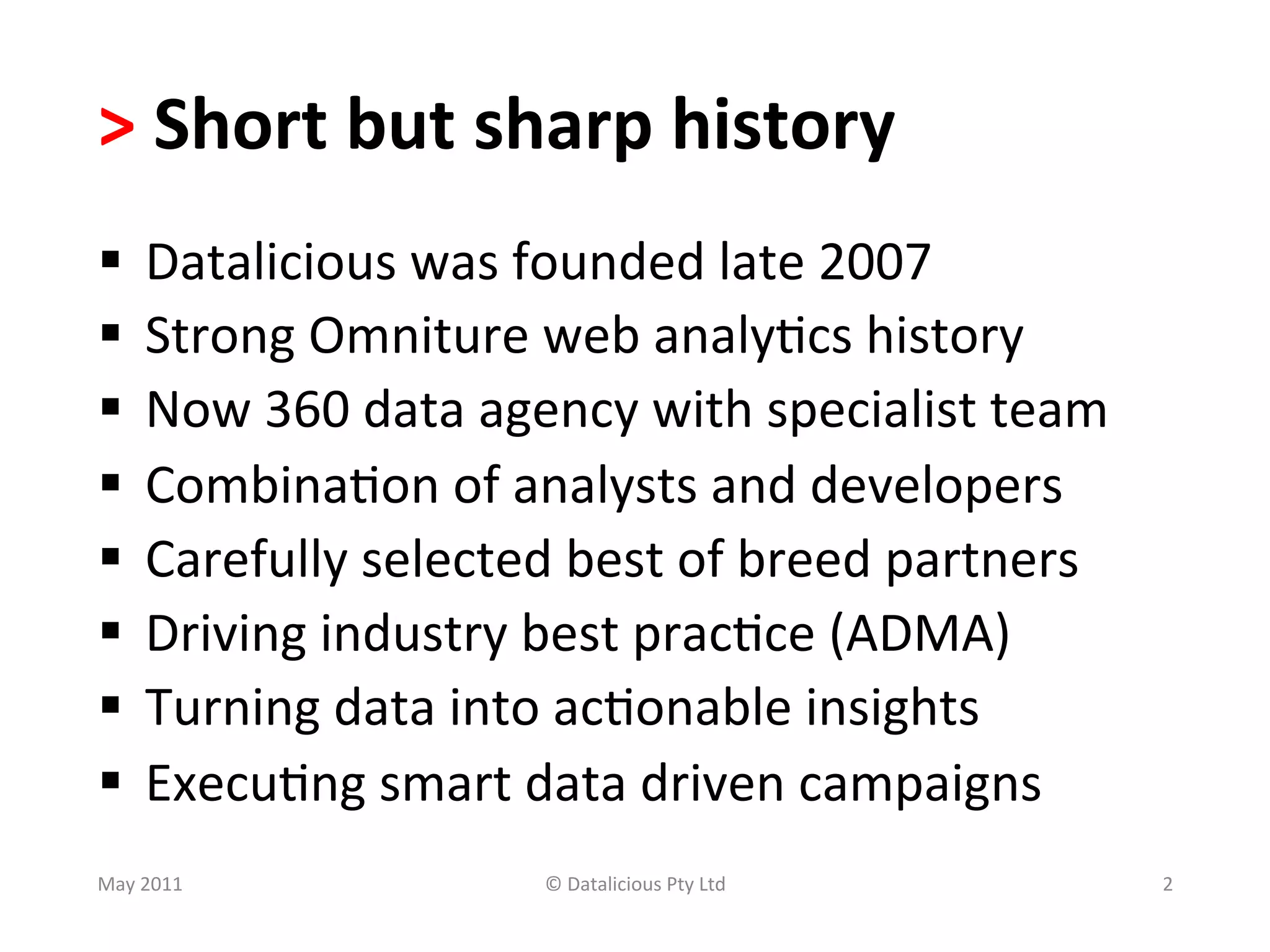Datalicious, founded in late 2007, offers comprehensive digital measurement services through a combination of data analytics and developer expertise, focusing on actionable insights and data-driven marketing campaigns. The document outlines various digital metrics, cookie tracking limitations, and the importance of accurately measuring engagement and conversions across marketing channels. Additionally, it emphasizes the significance of social media, traffic analysis, and the need for clear frameworks to interpret data effectively.